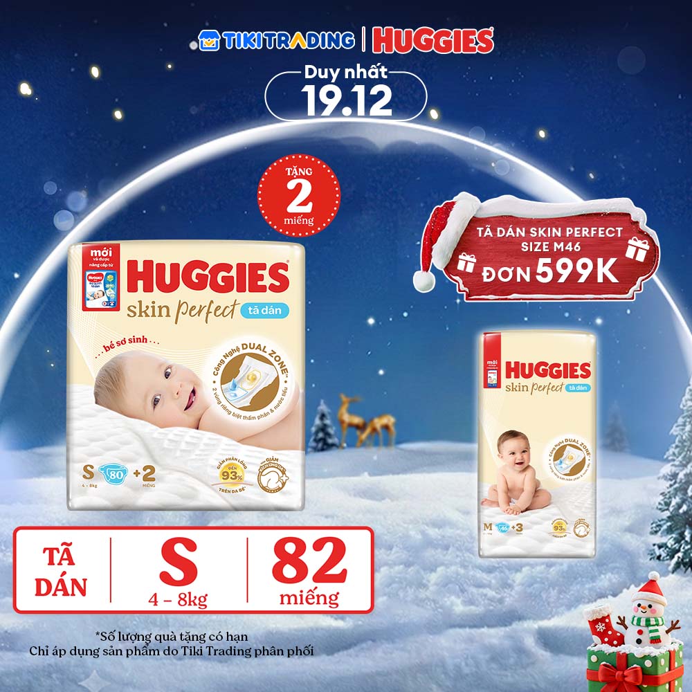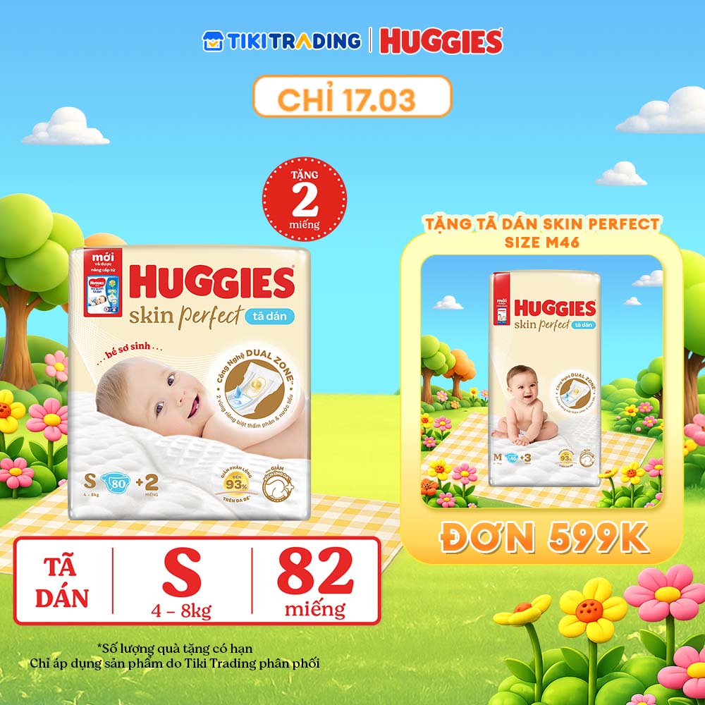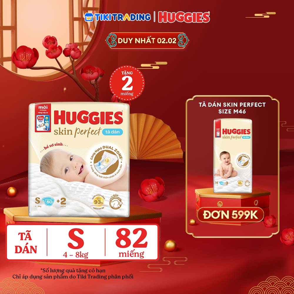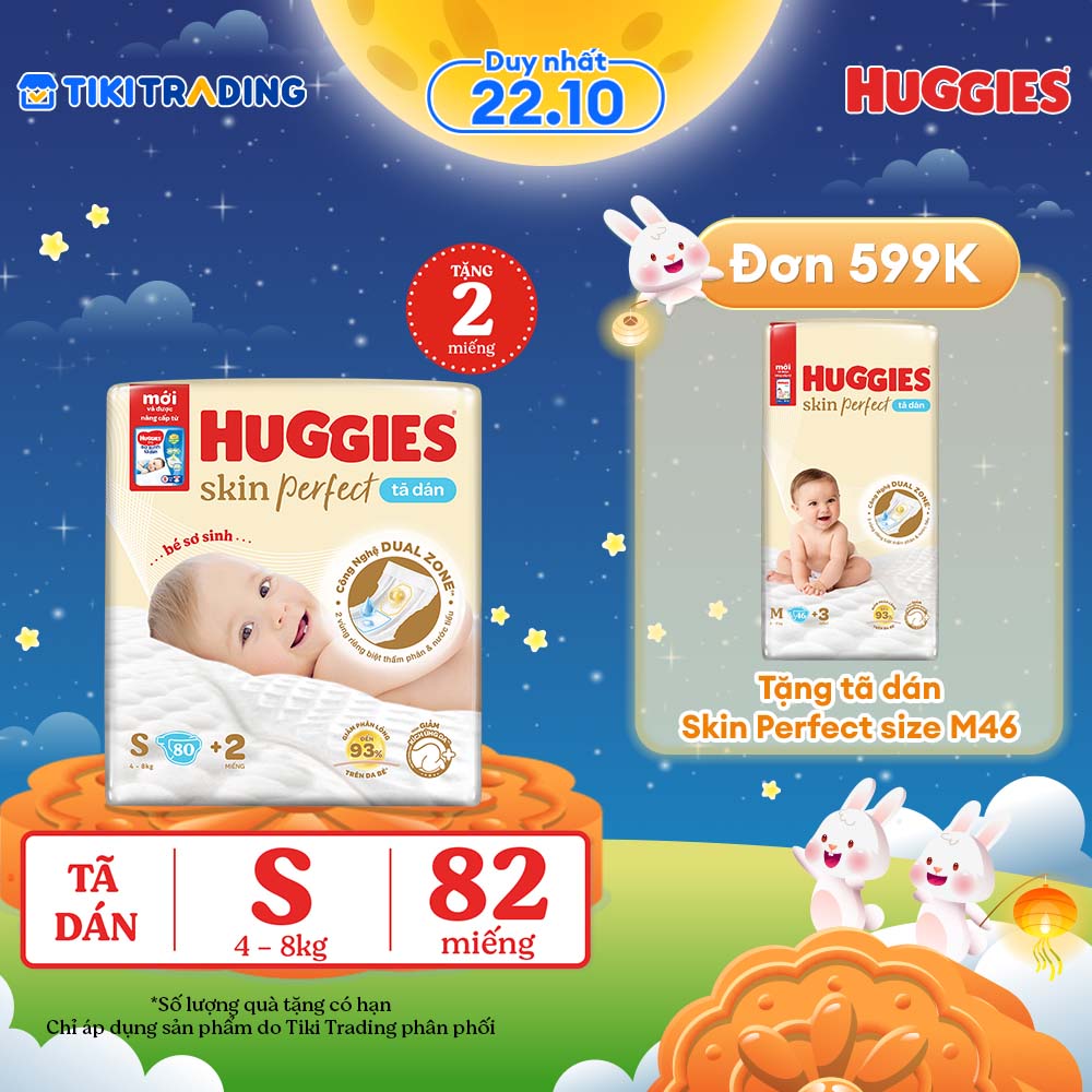 Thông số kỹ thuật Tã/bỉm dán sơ sinh Huggies Skin Perfect S 80+2 miếng với 2 vùng thấm giảm kích ứng da