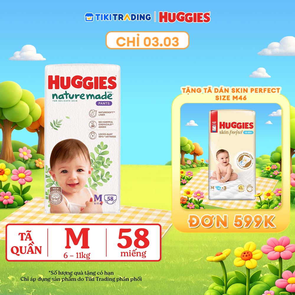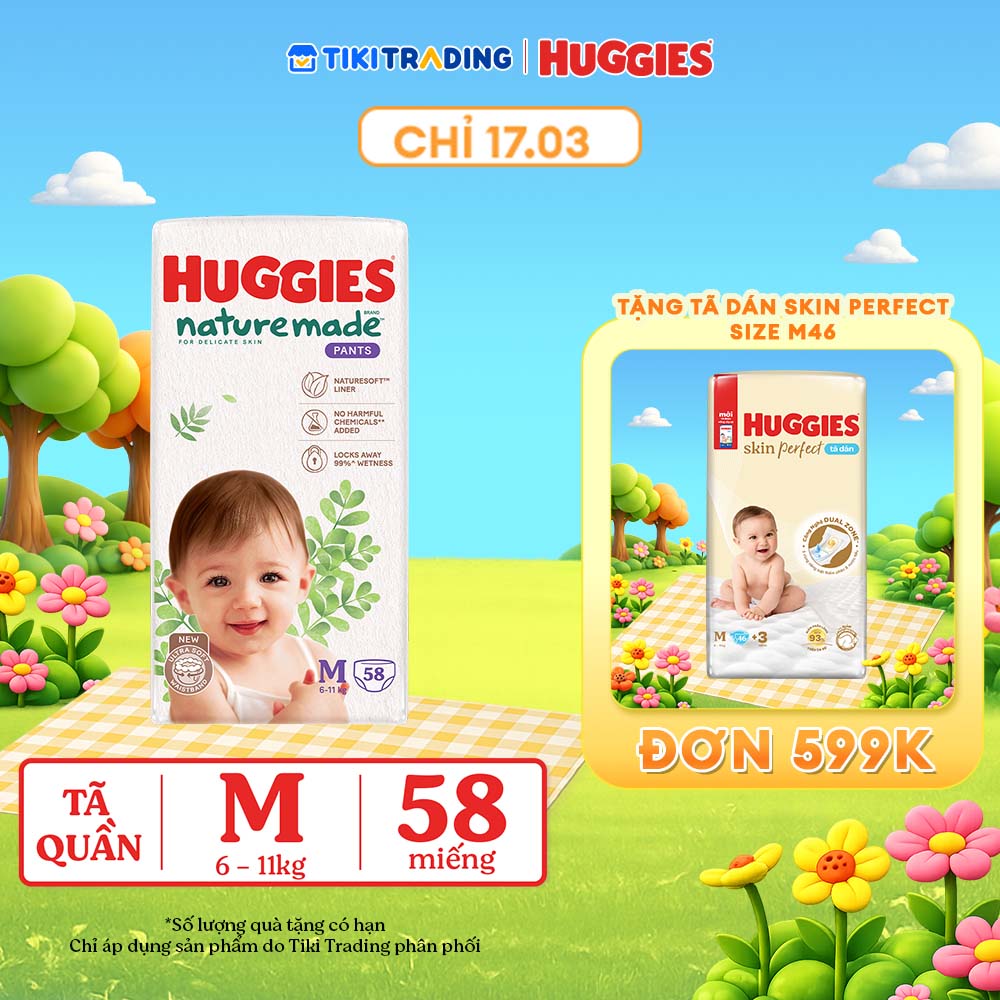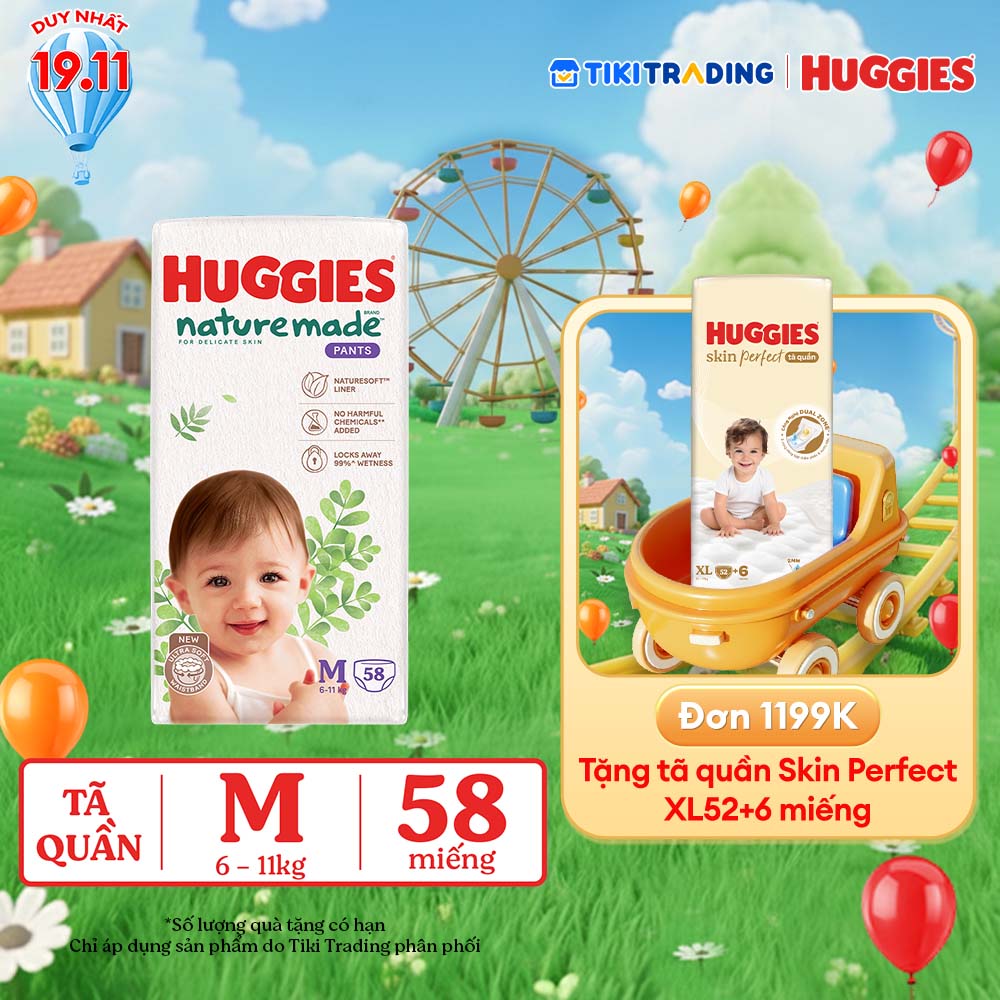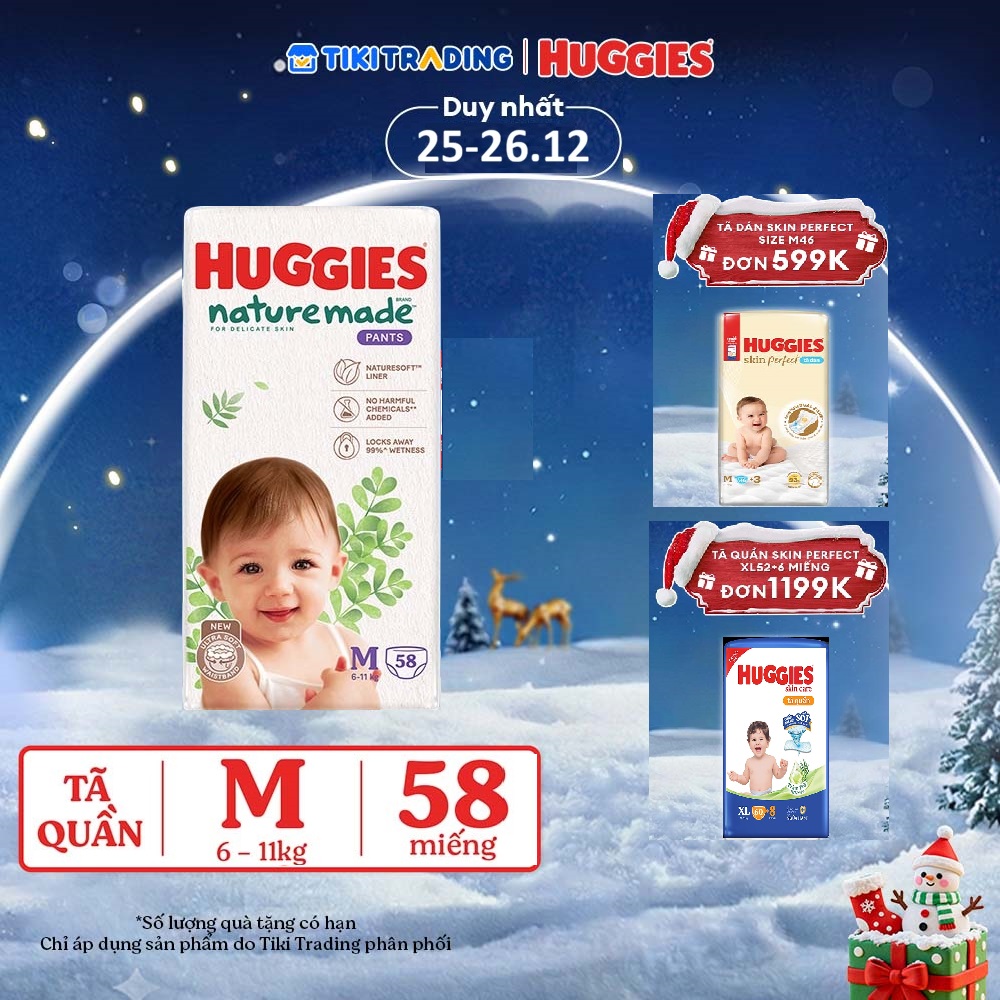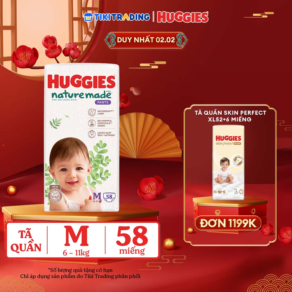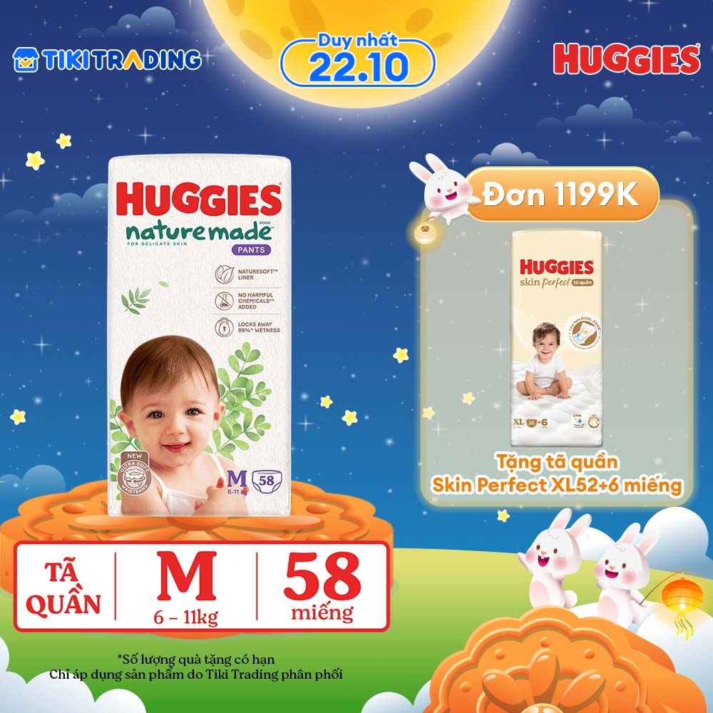 Thông số kỹ thuật Tã/bỉm quần Huggies Naturemade M58/L44/XL38/XXL26
