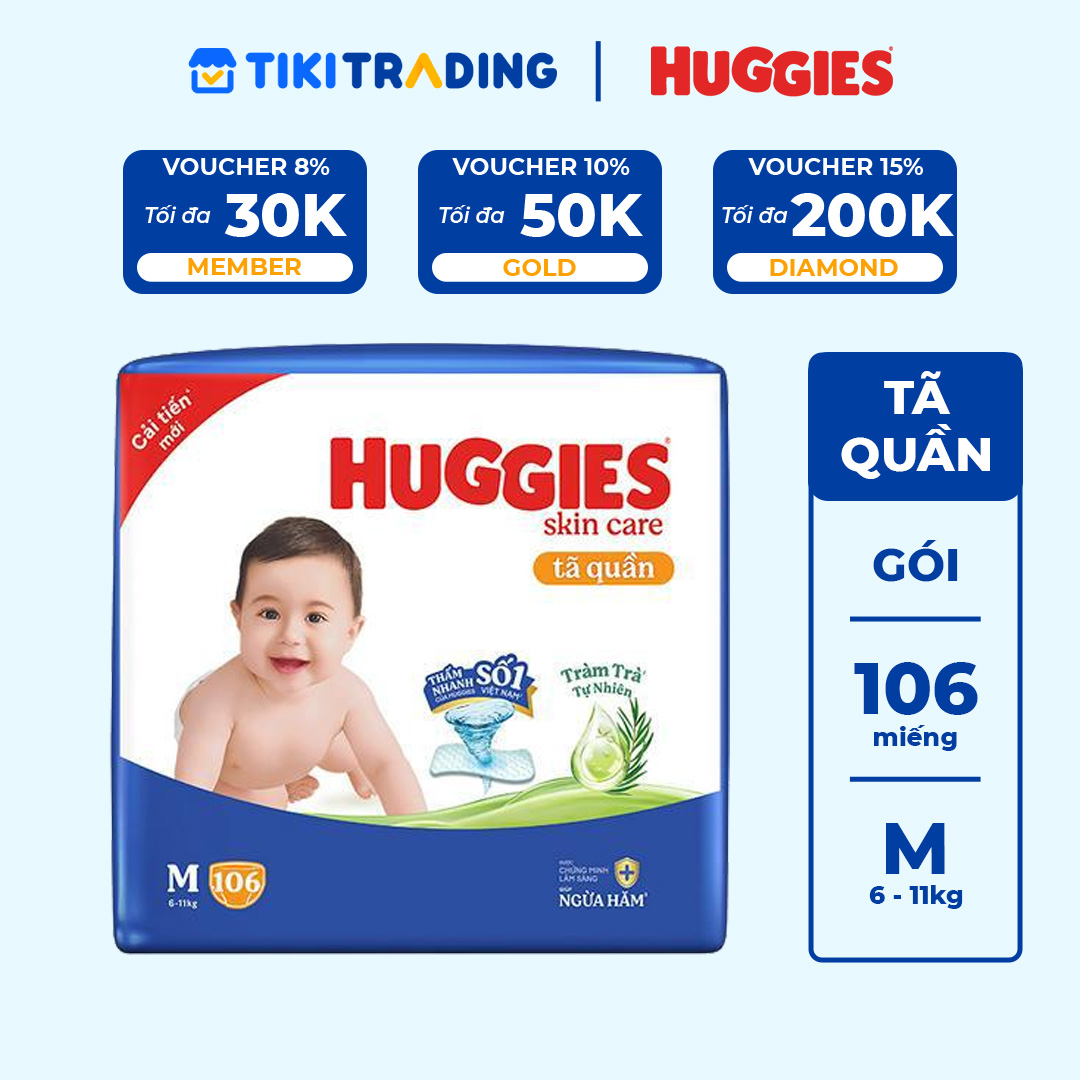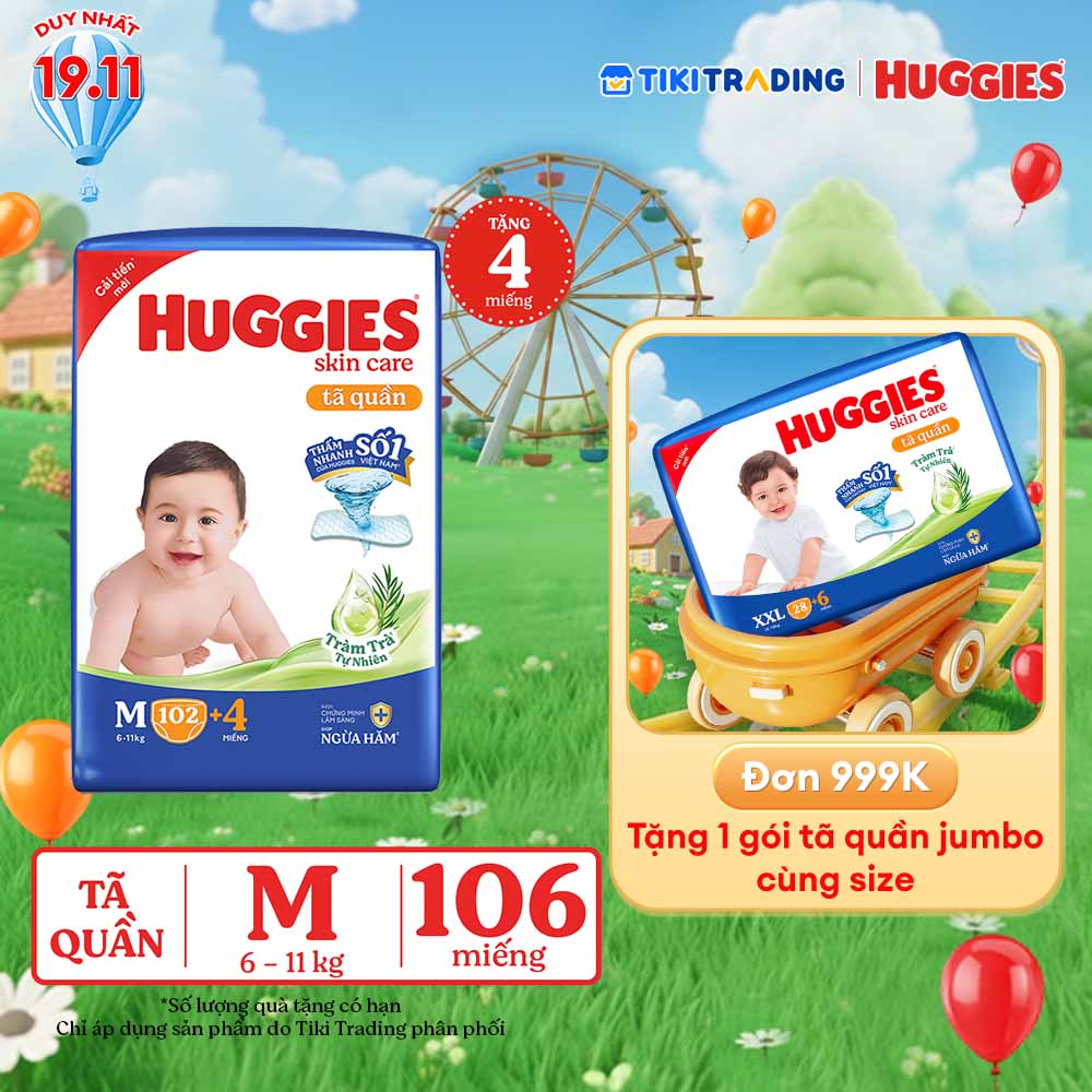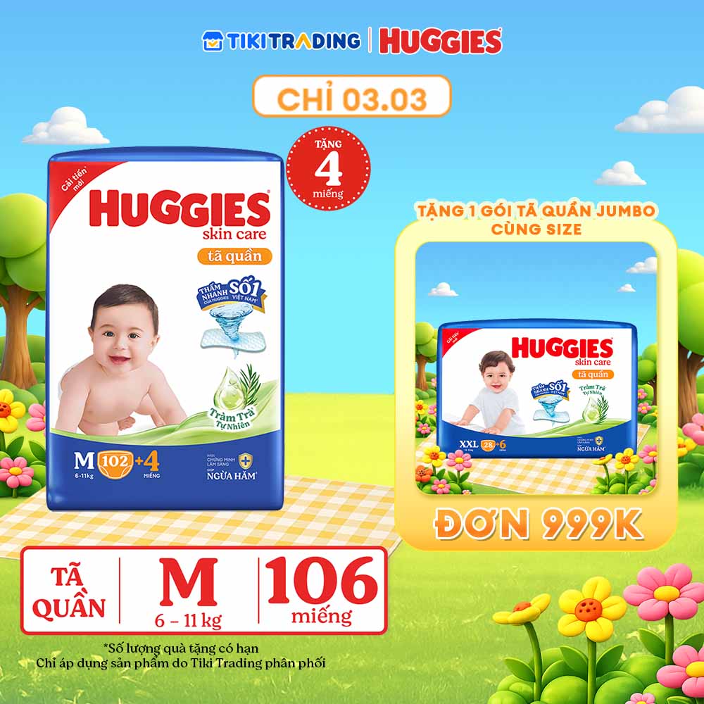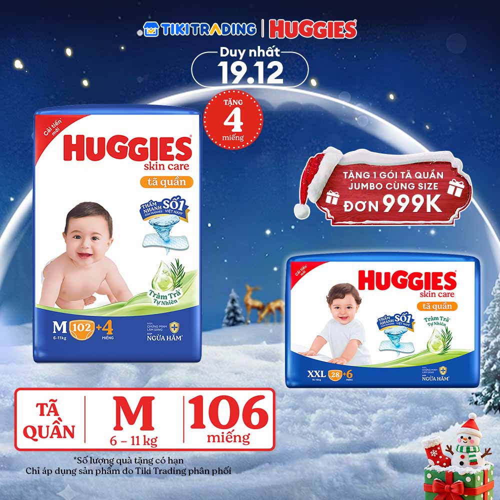 Thông số kỹ thuật Tã/bỉm quần Huggies Skin Care Mega Jumbo M102+4 miếng với tràm trà dịu da