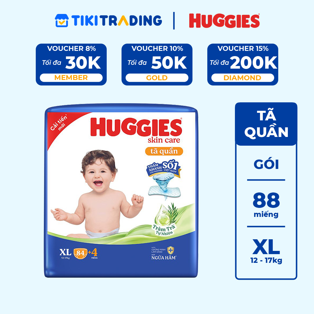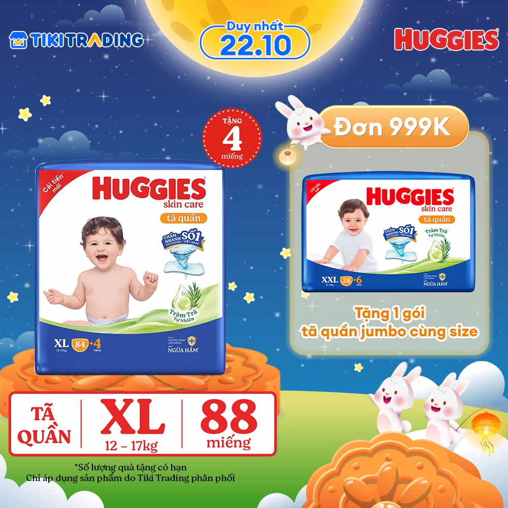 Tã/bỉm quần Huggies Skin Care Mega Jumbo XL84+4 miếng với tràm trà dịu da
