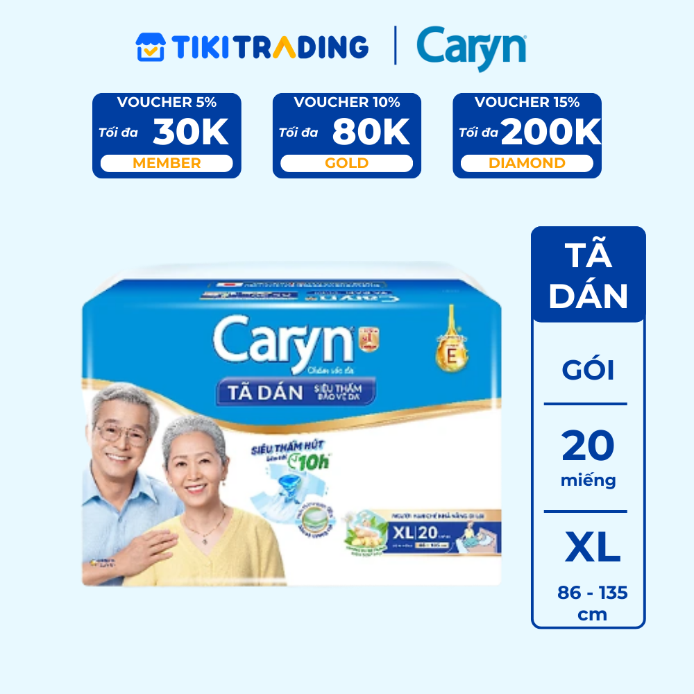 - Tã dán Caryn siêu thấm XL20 là sản phẩm được thiết kế đặc biệt dành cho người lớn, đặc biệt là những người lớn tuổi hoặc người có nhu cầu đặc biệt. Với khả năng thấm hút vượt trội và thiết kế thông minh, Caryn XL20 mang đến cảm giác khô thoáng, thoải mái suốt cả ngày.