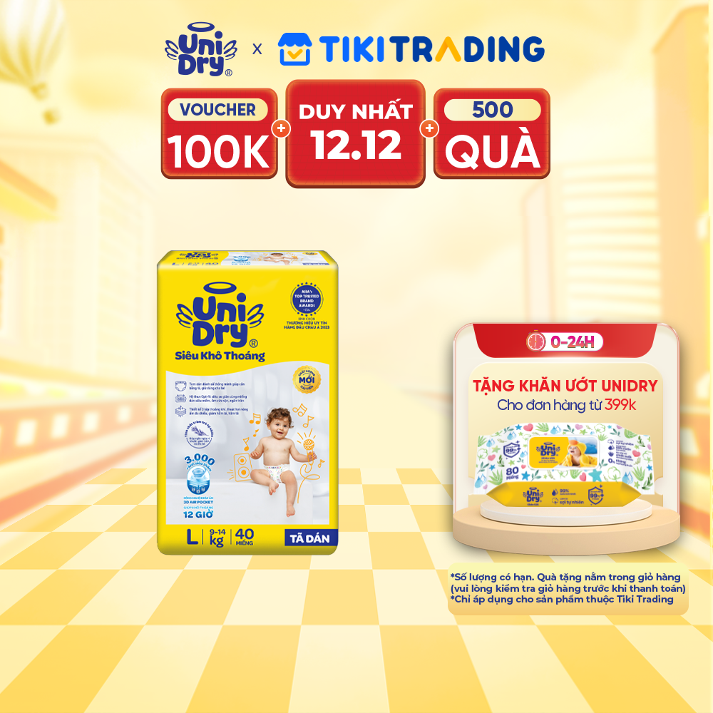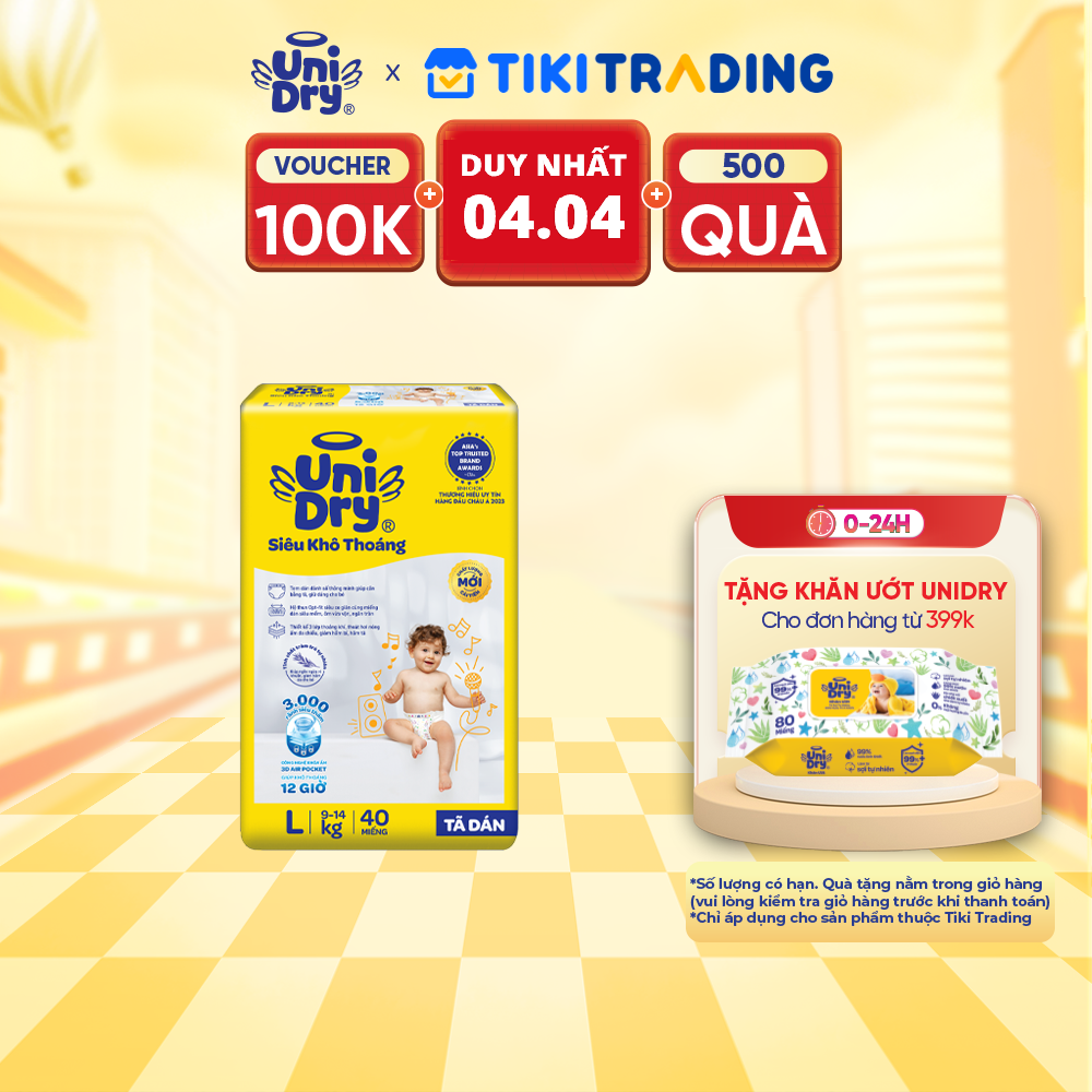 Thông số kỹ thuật Tã dán em bé Siêu khô thoáng gói Jumbo Unidry G6X size L-40 miếng