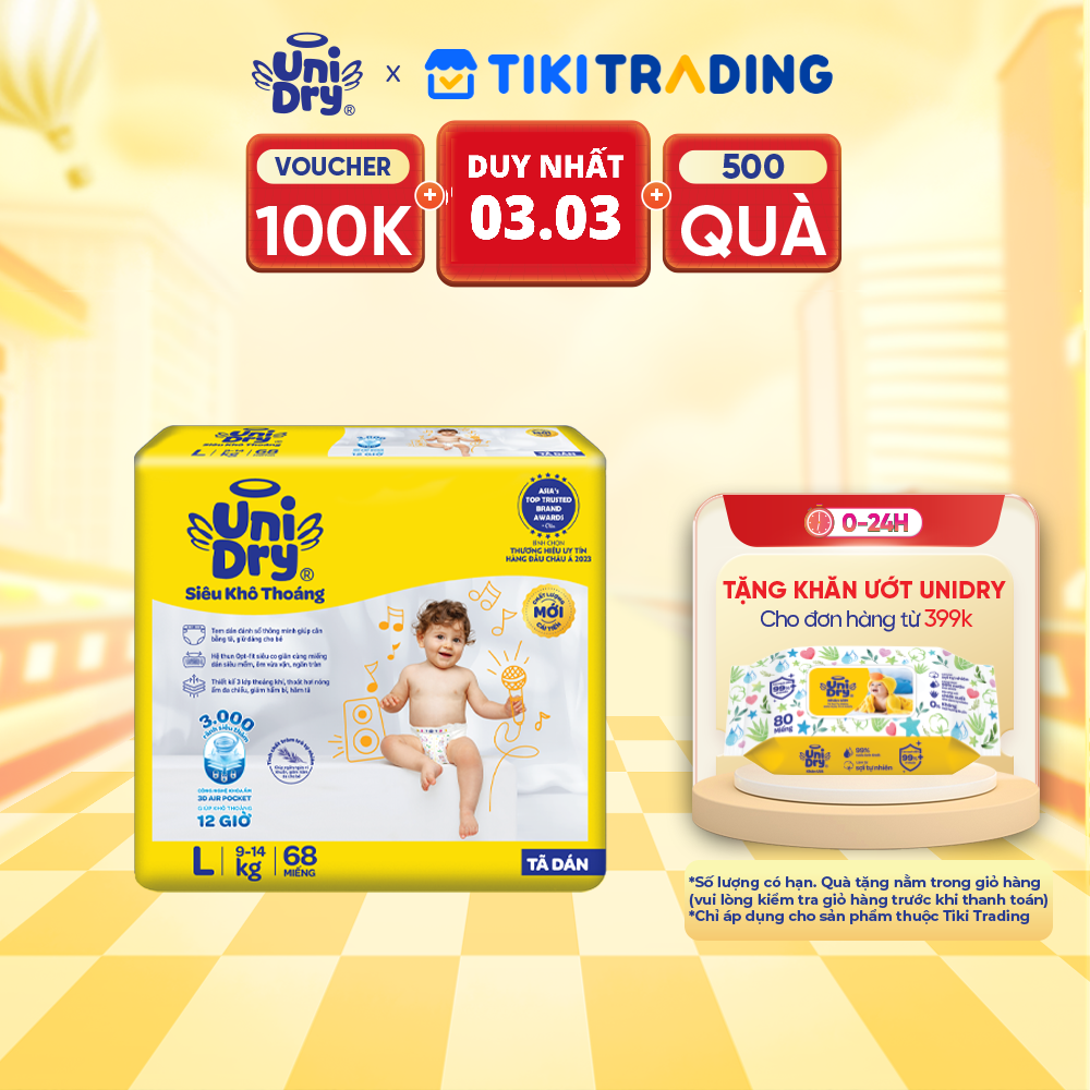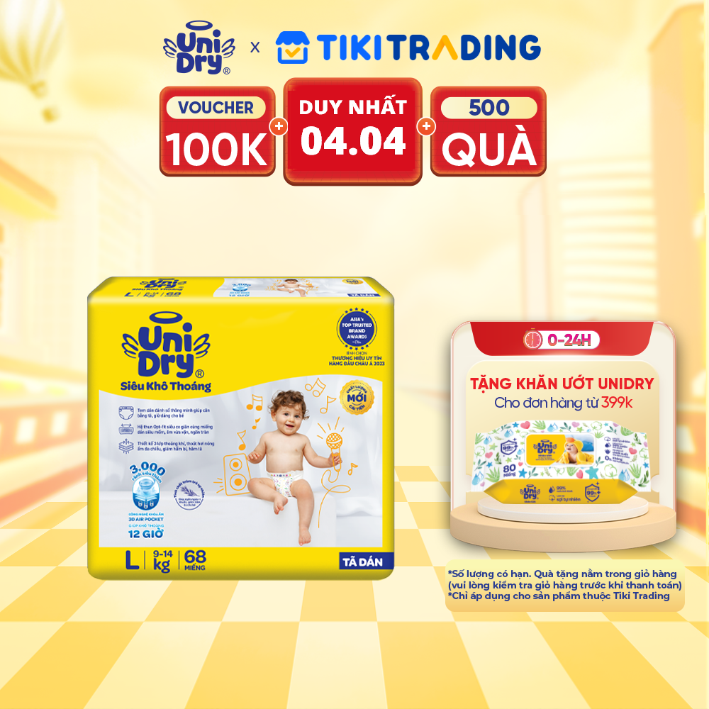 Thông số kỹ thuật Tã dán em bé Siêu khô thoáng gói Super Jumbo Unidry G6X size L-68 miếng