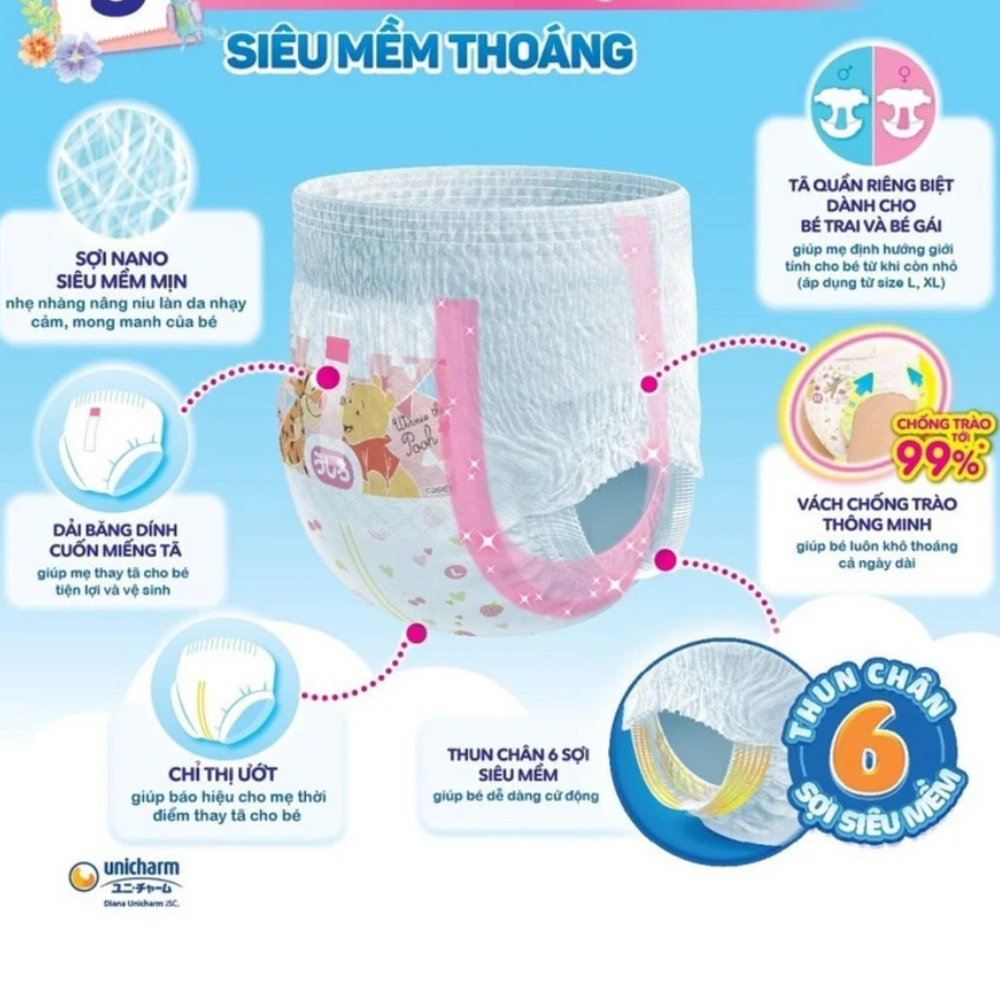 - Tã quần Moony man size XL bé gái sở hữu thiết kế mới với lưng thun che phủ trên eo, giảm thiểu các khoảng hở giúp xua tan nguy cơ bị tràn tã, từ đó cho trẻ khô thoáng cả ngày.