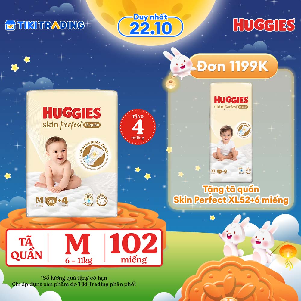 - Huggies Skin Perfect có công nghệ 2 vùng thấm (Dual Zone), thấm hút đến 12 giờ, chống tràn vượt trội, phù hợp với bé vận động nhiều hoặc dùng ban đêm.