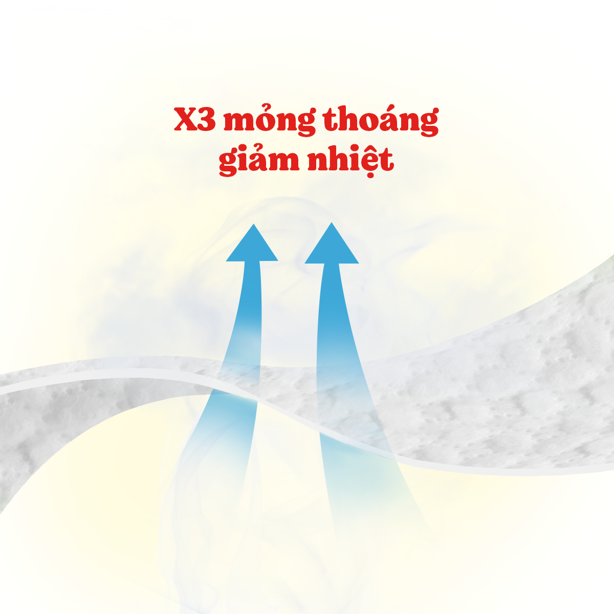 - Lõi tã mỏng nhẹ, thoáng mát gấp 3 lần***, mang lại cho bé cảm giác thoải mái, giúp giảm nhiệt độ bên trong tã.