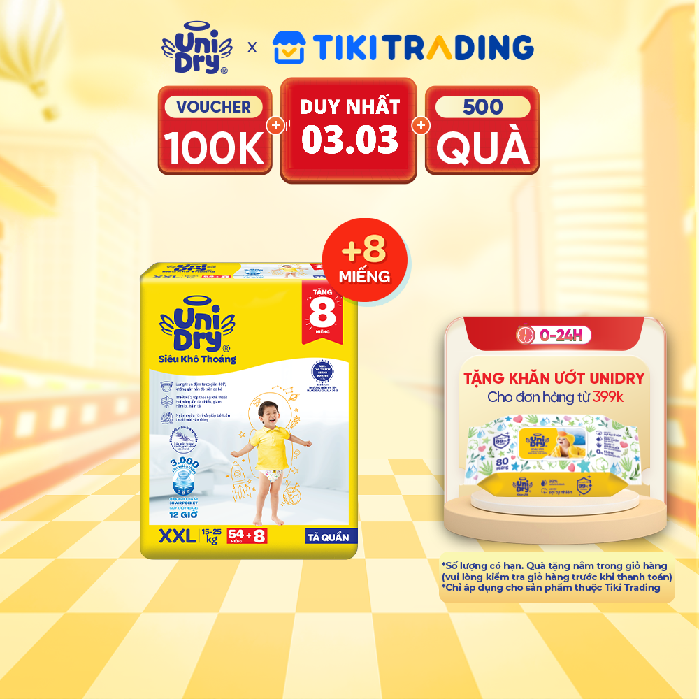 Thông số kỹ thuật Tã quần UniDry Siêu khô thoáng gói Jumbo mới size XXL