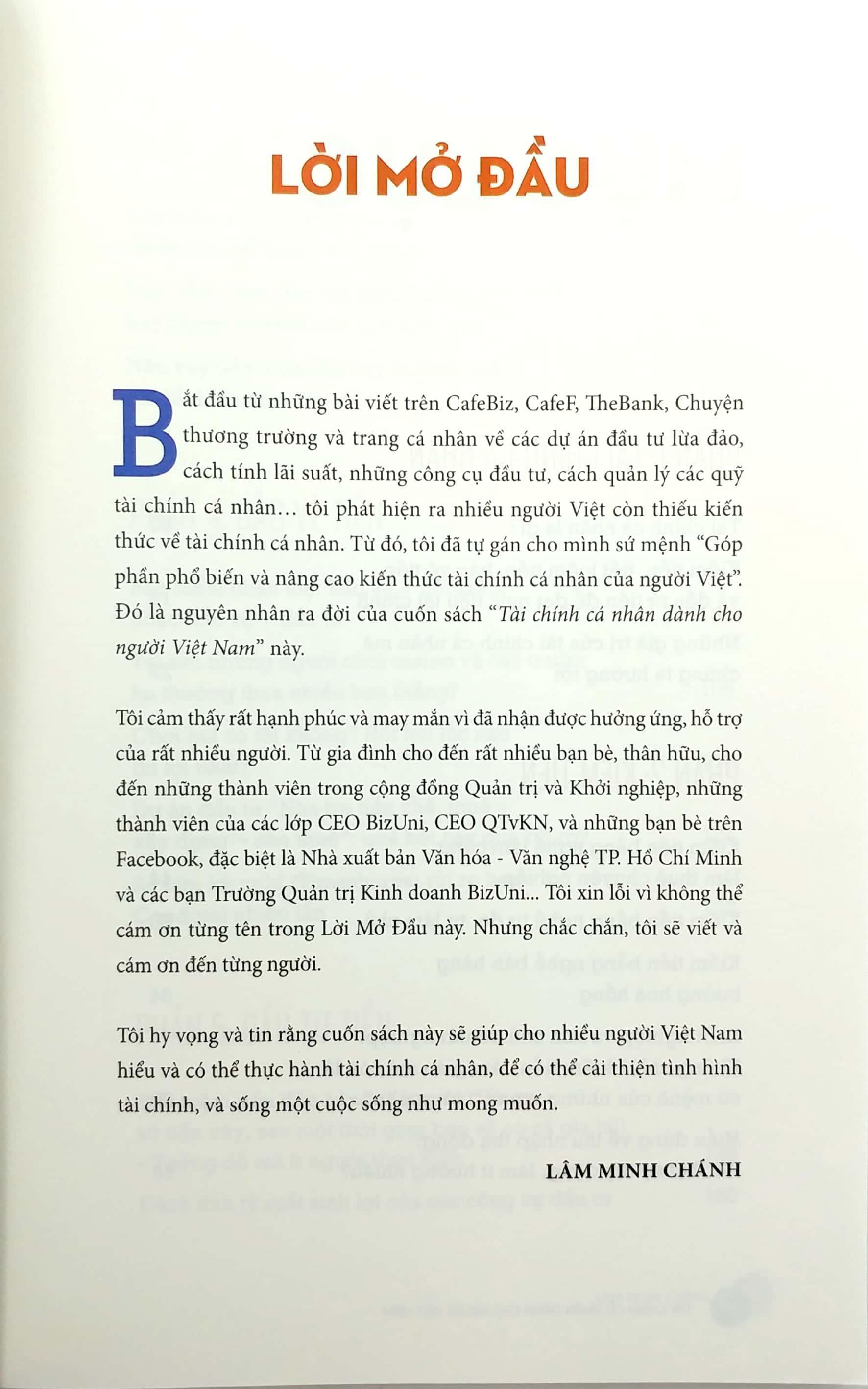 Tôi hy vọng và tin rằng cuốn sách này sẽ giúp cho nhiều người Việt Nam hiểu và có thể thực hành tài chính cá nhân, để có thể cải thiện tình hình tài chính, và sống một cuộc sống như mong muốn.