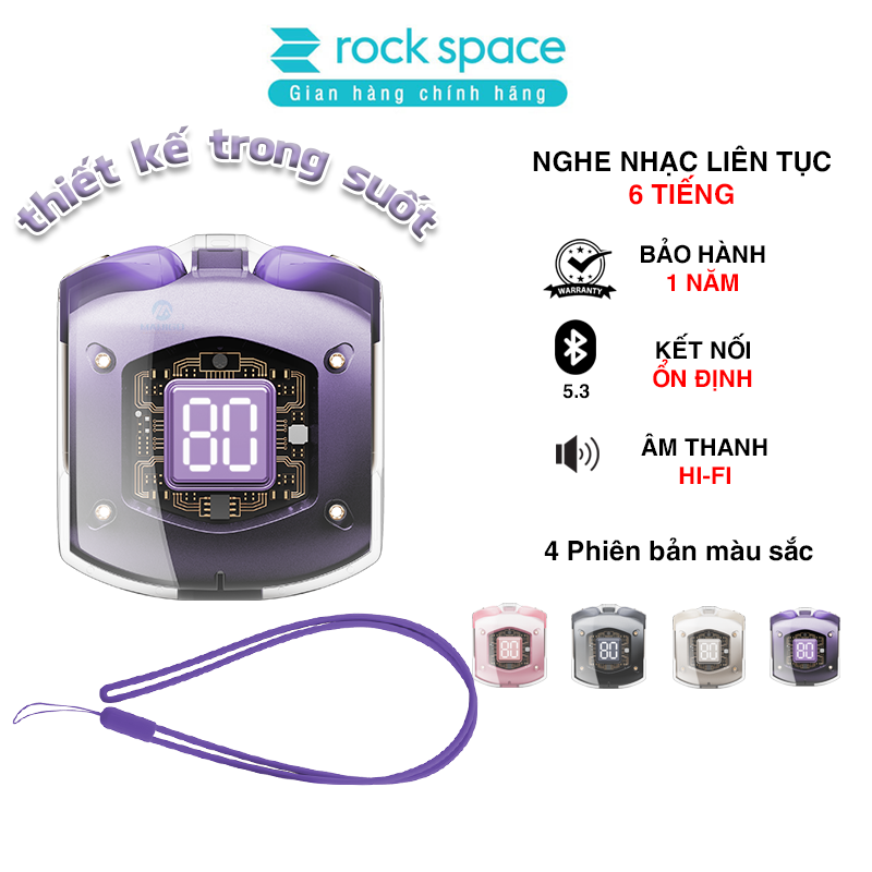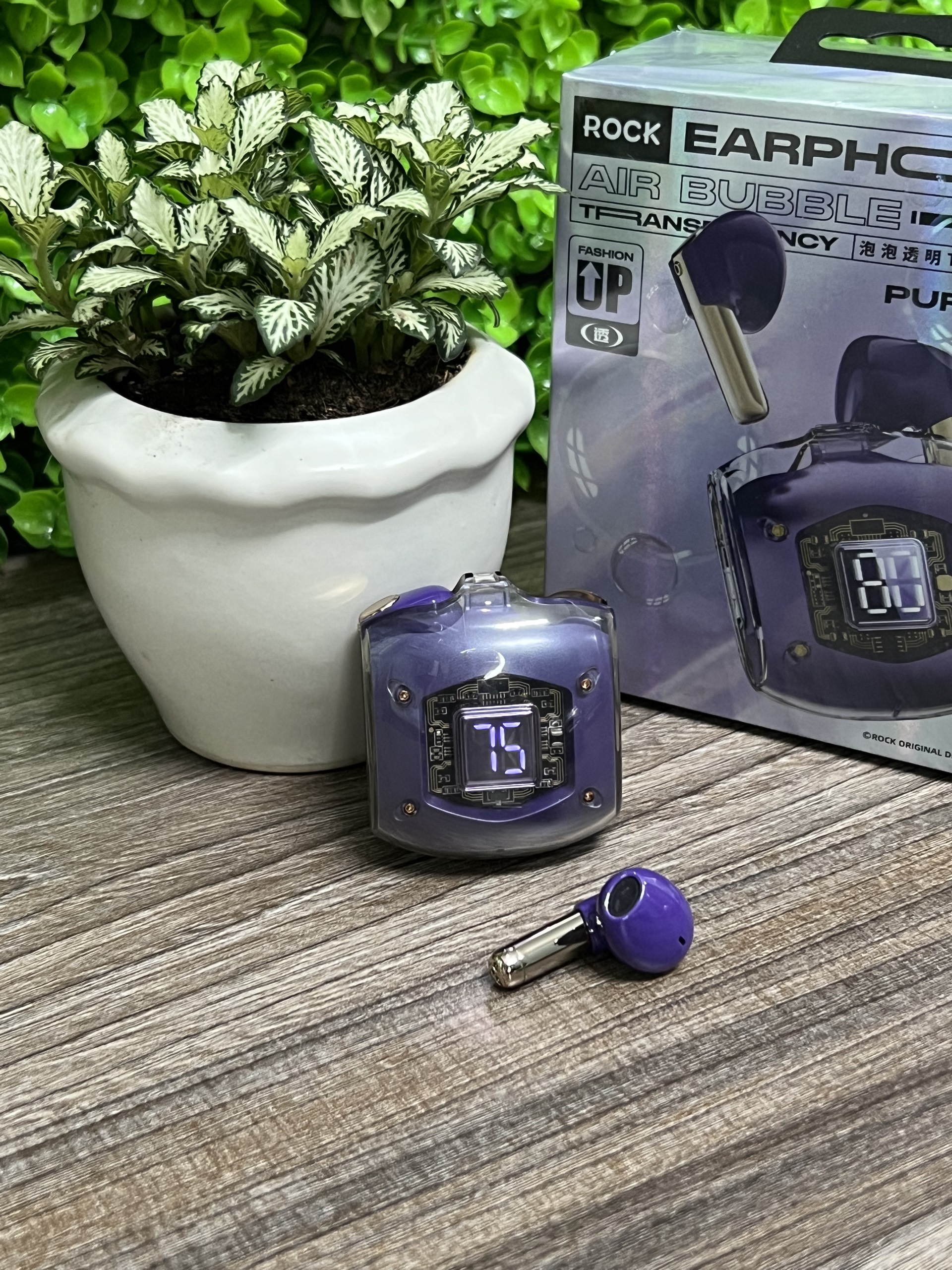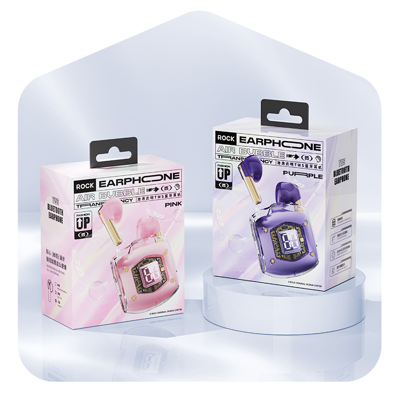 - Tai nghe Bluetooth nhét tai không dây TWS Rockspace Air Bubble được thiết kế trong suốt có tính thẩm mỹ cao, có hiển thị % pin trên hộp sạc. Có dây đi kèm rất tiện lợi