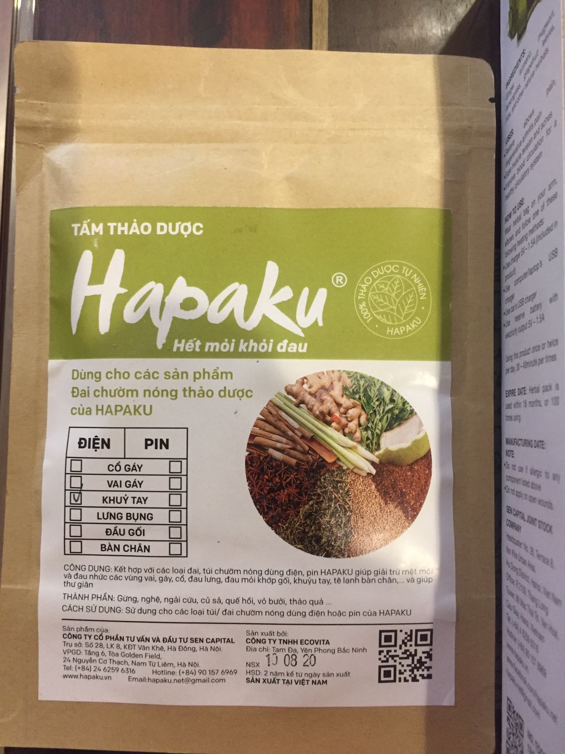 Thành phần túi thảo dược Hapaku được nghiên cứu và tạo ra từ 100% các loại thảo mộc tự nhiên truyền thống được sử dụng lâu đời như ngải cứu, gừng, nghệ, xuyên khung, xả, bưởi, chanh, quyết minh tử... giúp đả thông kinh mạch, giải trừ đau mỏi, thư giãn tinh thần.