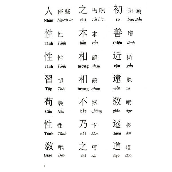 Sách không hẳn là do thánh nhân làm ra, nhưng nó là kết tinh của sách vở thánh hiền truyền lại. Chỉ hơn một ngàn chữ mà nêu ra đủ trọng tâm các vấn đề: Từ bản tính sơ sinh “tính tương cận, Tập tương viễn” đến giáo pháp, giáo đạo “Ngọc bất trác bất thành khí, nhân bất học bất tri lý”, Tu tề, Hiếu đễ, từ bản thân đến vạn vật, vụ trụ: Tam tài, tam quang, tam cương, ngũ hành, ngũ nghĩa, ngũ thường… Tứ thư, Ngũ kinh, gương chuyên cần, đạo xử thế… còn lược kê cả những diễn biến lịch sử Trung Quốc từ Phục Hy, Thần nông đến Minh, Thanh….