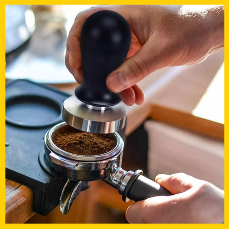 Tamper Nén Cà Phê Espresso Size 58mm ,53mm, 51mm với mặt nén được làm bằng thép không rỉ, được vát phẳng tuyệt đối. Tay cầm bằng nhôm được sơn nhám mang đến độ bền cao, giúp cảm giác cầm nắm tốt, chắc tay và tạo lực đồng đều.