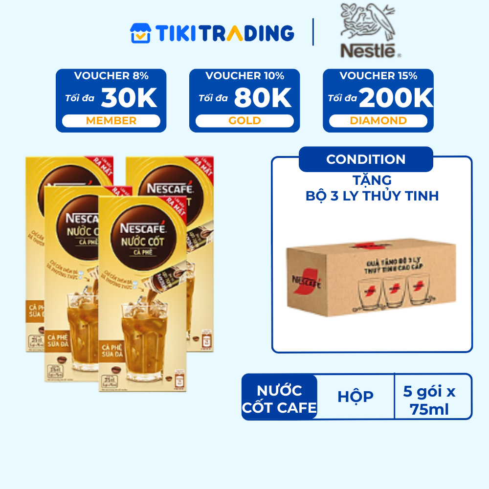 Thông số kỹ thuật [TẶNG 3 LY THUỶ TINH] Combo 4 hộp nước cốt cà phê NESCAFÉ - CÀ PHÊ SỮA ĐÁ (4 hộp x 5 gói x 75ml)