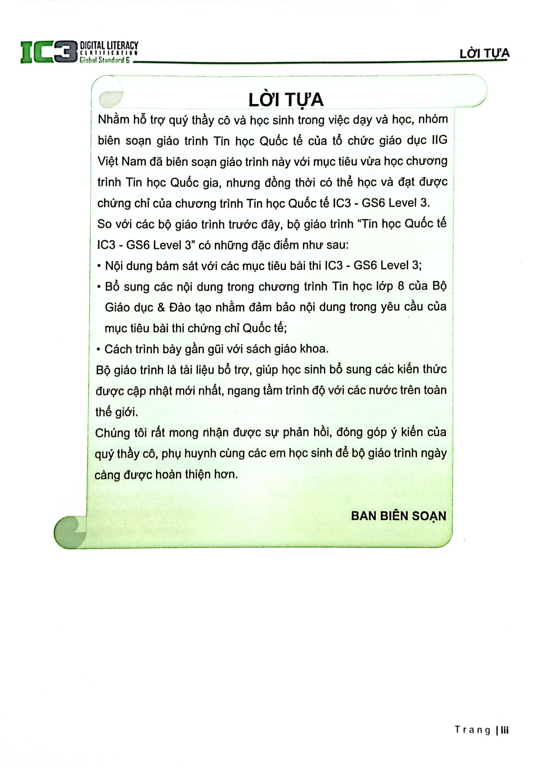 Nhằm hỗ trợ quí thầy cô và học sinh trong việc dạy và học, với mục tiêu vừa học chương trình tin học Quốc gia, nhưng đồng thời có thể học và lấy được chứng chỉ của chương trình Tin học Quốc tế IC3 GS6 - Level 3, nhóm biên soạn giáo trình Tin học Quốc tế của tổ chức giáo dục IIG Vietnam biên soạn giáo trình này.