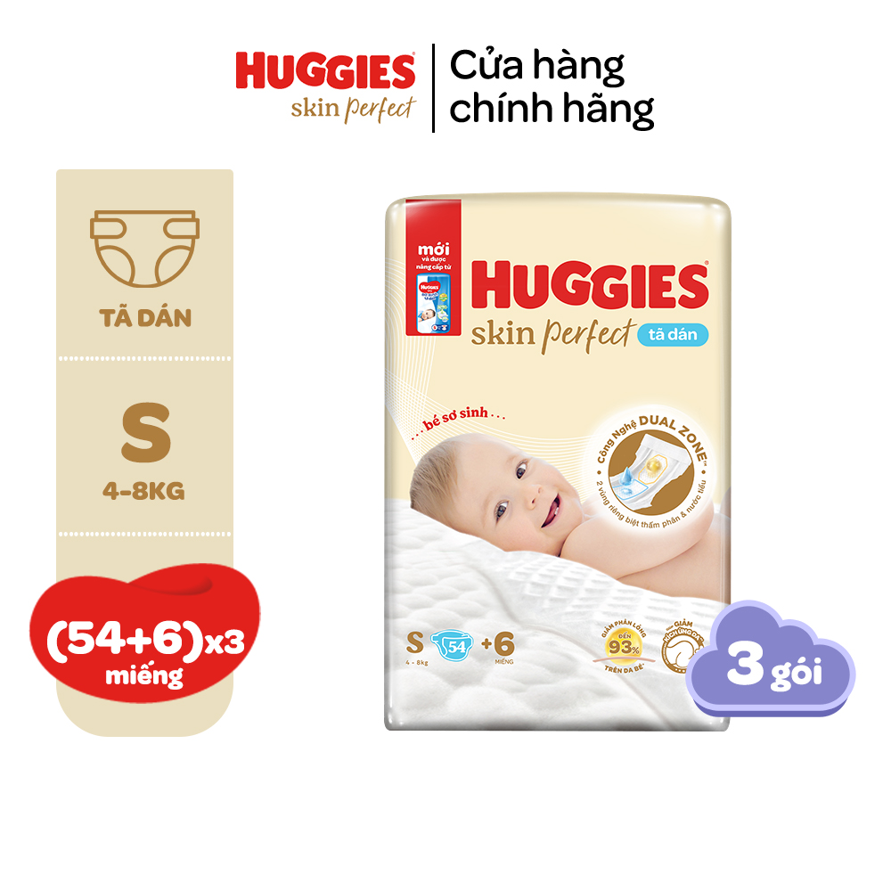 Tã/bỉm dán sơ sinh Huggies Skin Perfect 2 vùng thấm giảm kích ứng da size NB/S tự hào là chiếc tã đầu tiên ở Việt Nam với 2 vùng thấm phân và nước tiểu riêng biệt, giúp hạn chế sự trộn lẫn của phân và nước tiểu, từ đó giảm nguy cơ kích ứng da cho bé. Đây là cải tiến đầu tiên trên thị trường - công nghệ Dual zone, giúp mẹ có sự chăm sóc tốt nhất cho làn da nhạy cảm của con!