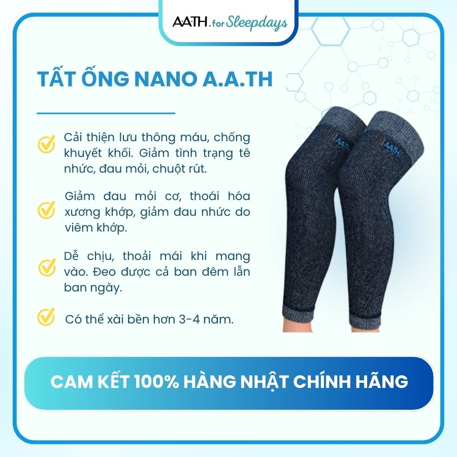 1. Lợi ích: Tất nano A.A.TH Nhật Bản giúp cải thiện lưu thông máu, chống huyết khối, giảm viêm giảm đau nhức. Sử dụng Tất nano A.A.TH sẽ giúp loại bỏ tình trạng tê bì, đau mỏi, nặng chân, sưng nhức, chuột rút, lạnh chân tay, ngủ kém ngon, … do giãn tĩnh mạch, thoái hóa khớp, căng cơ do vận động quá sức hoặc lưu thông máu kém gây ra.