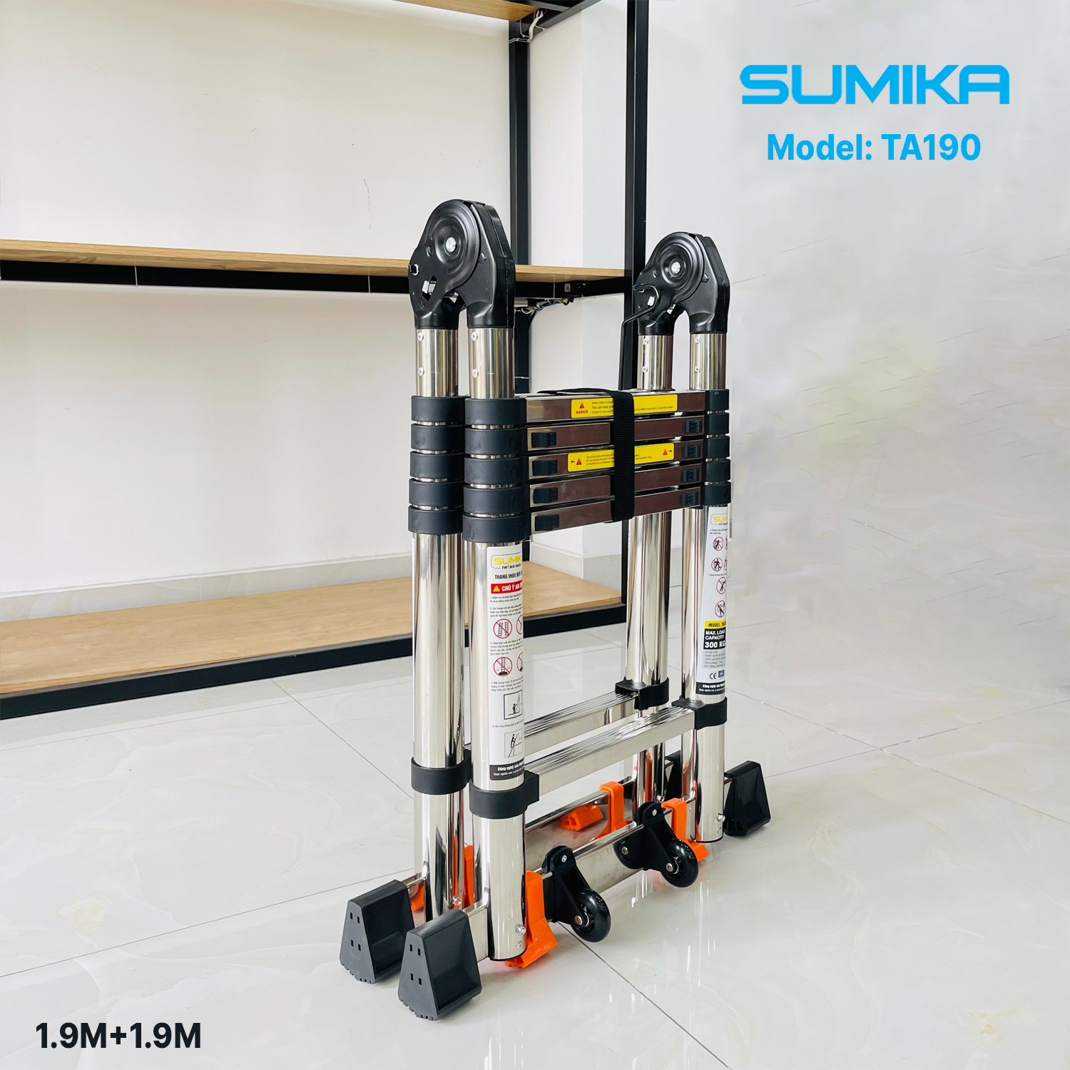 Thang Inox rút đôi SUMIKA TA190 - rút chữ A cao 1.9m, rút chữ I cao 3.8m, tải trọng 300kg