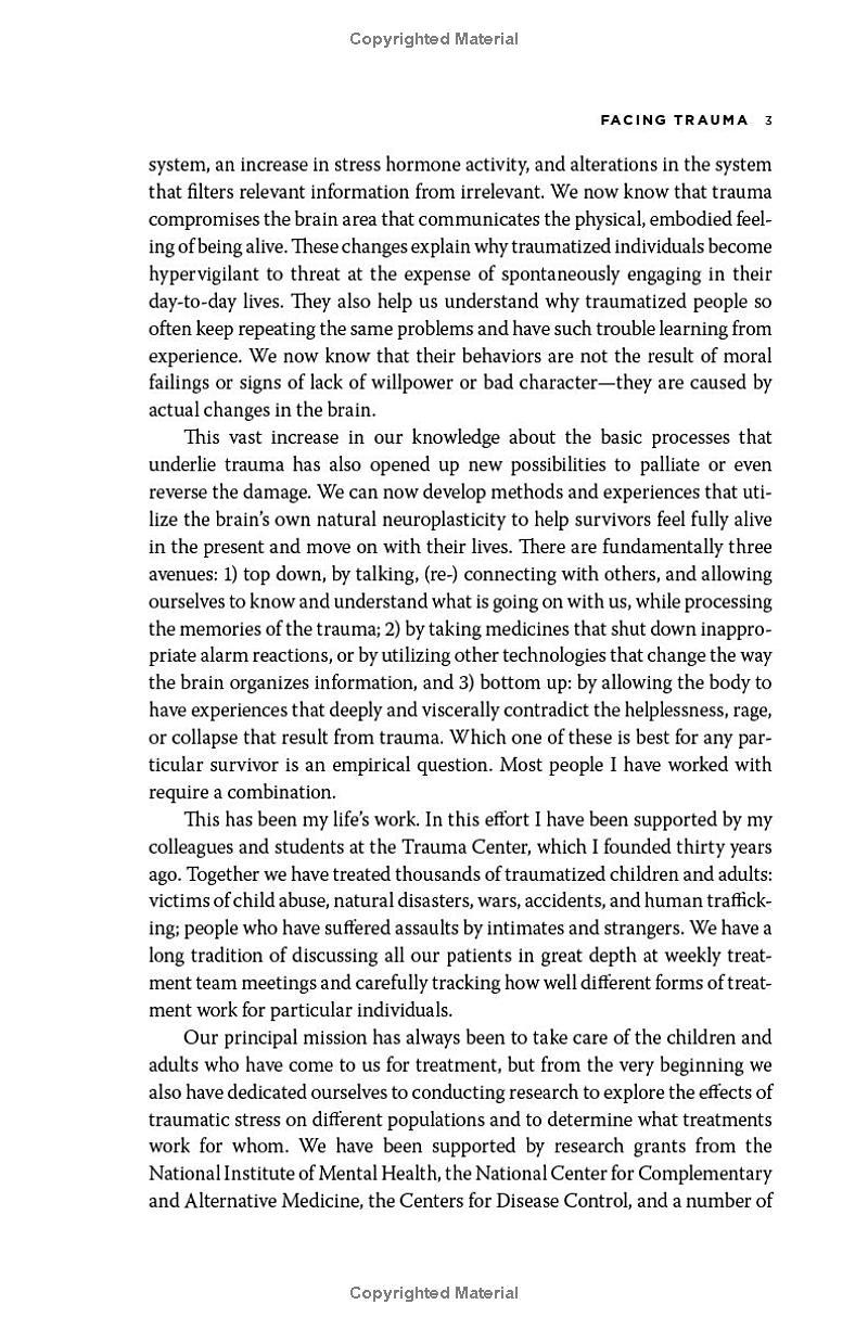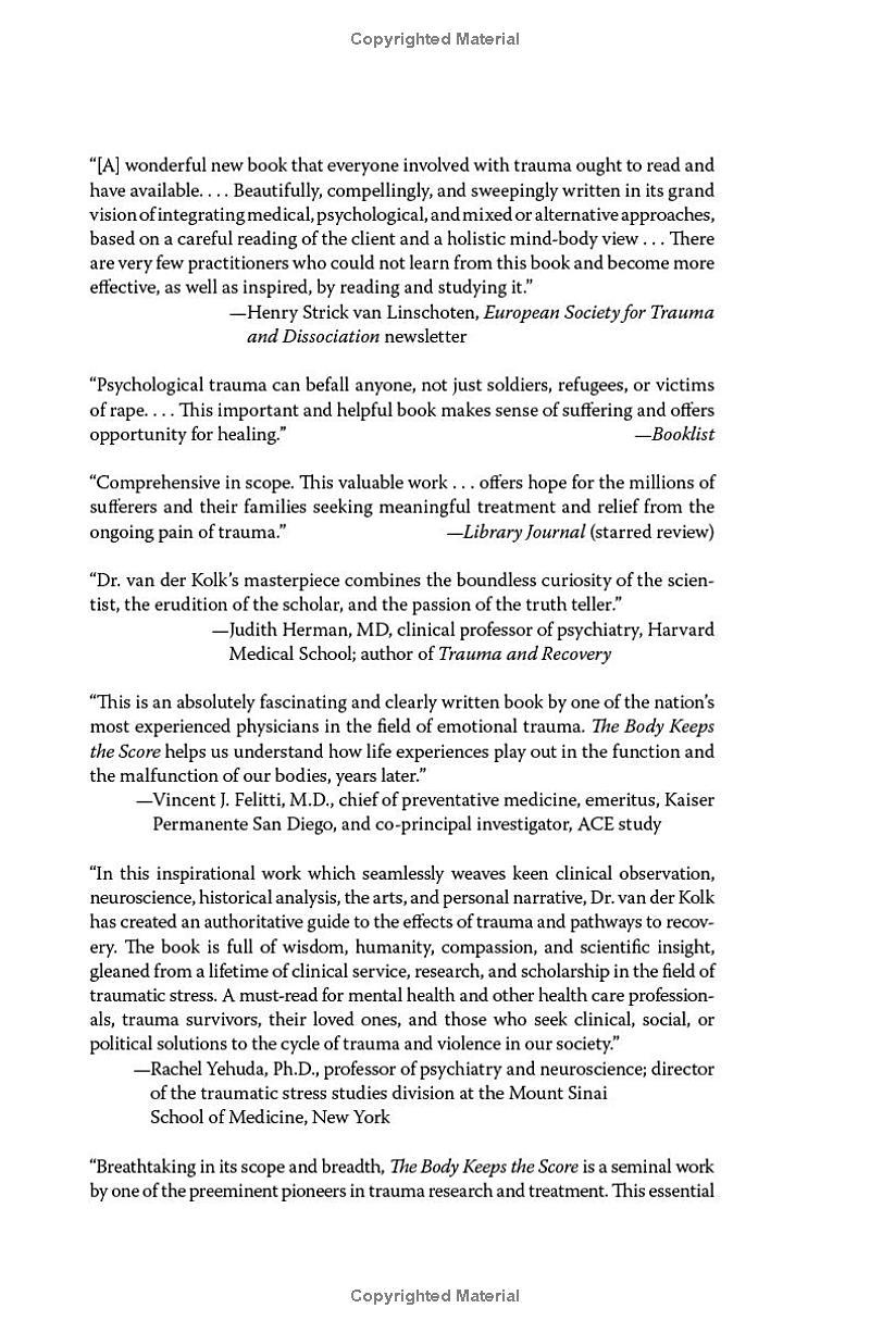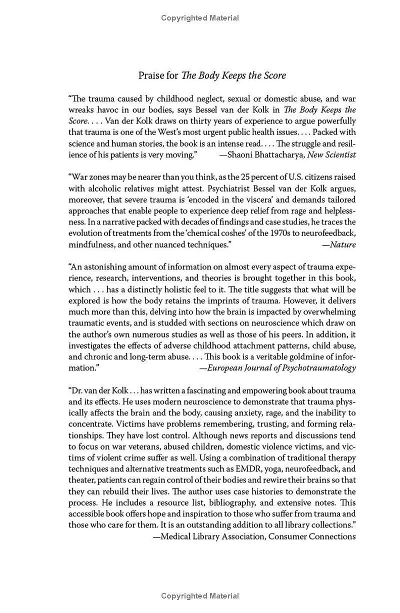 Trauma is a fact of life. Veterans and their families deal with the painful aftermath of combat; one in five Americans has been molested; one in four grew up with alcoholics; one in three couples have engaged in physical violence. Dr. Bessel van der Kolk, one of the world’s foremost experts on trauma, has spent over three decades working with survivors. In The Body Keeps the Score, he uses recent scientific advances to show how trauma literally reshapes both body and brain, compromising sufferers’ capacities for pleasure, engagement, self-control, and trust. He explores innovative treatments—from neurofeedback and meditation to sports, drama, and yoga—that offer new paths to recovery by activating the brain’s natural neuroplasticity. Based on Dr. van der Kolk’s own research and that of other leading specialists, The Body Keeps the Score exposes the tremendous power of our relationships both to hurt and to heal—and offers new hope for reclaiming lives.