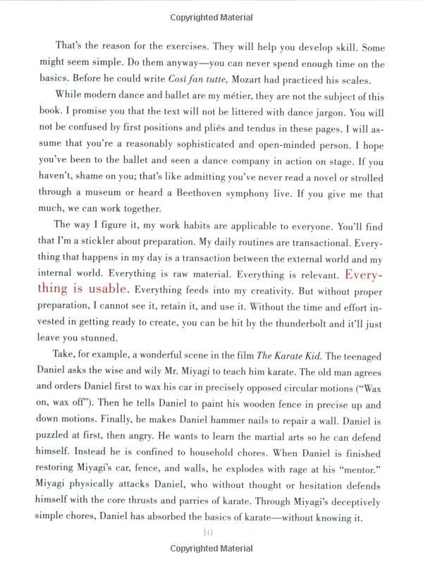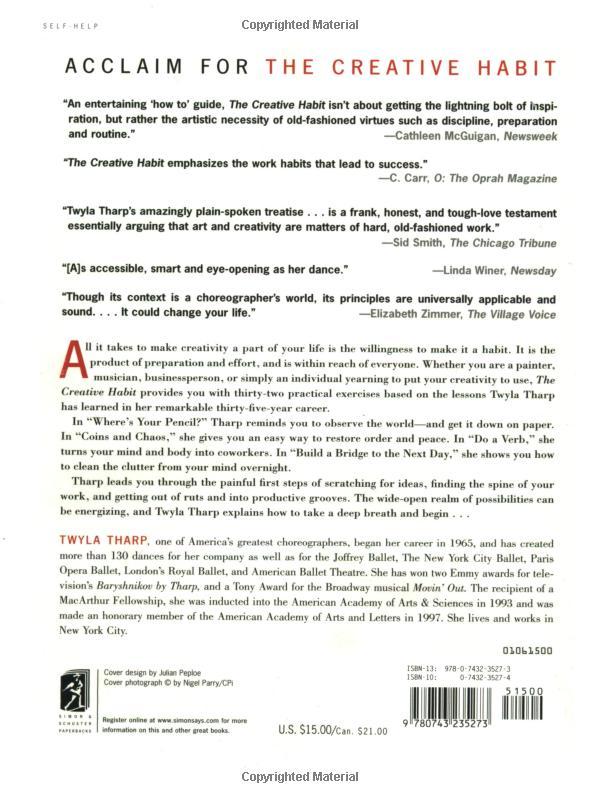What makes someone creative? How does someone face the empty page, the empty stage and making something where nothing existed before? Not just a dilemma for the artist, it is something everyone faces everyday. What will I cook that isn't boring? How can I make that memo persuasive? What sales pitch will increase the order, get me the job, lock in that bonus? These too, are creative acts, and they all share a common need: proper preparation. For Twyla Tharp, creativity is no mystery; it's the product of hard work and preparation, of knowing one's aims and one's subject, of learning from approaches taken in the past. It's a process undertaken every day. It's a habit. The Creative Habit is not merely a look inside the mind of a remarkable woman with remarkable skills, but a programmatic, inspiring, encouraging guide to help each of us achieve our fullest creative potential.