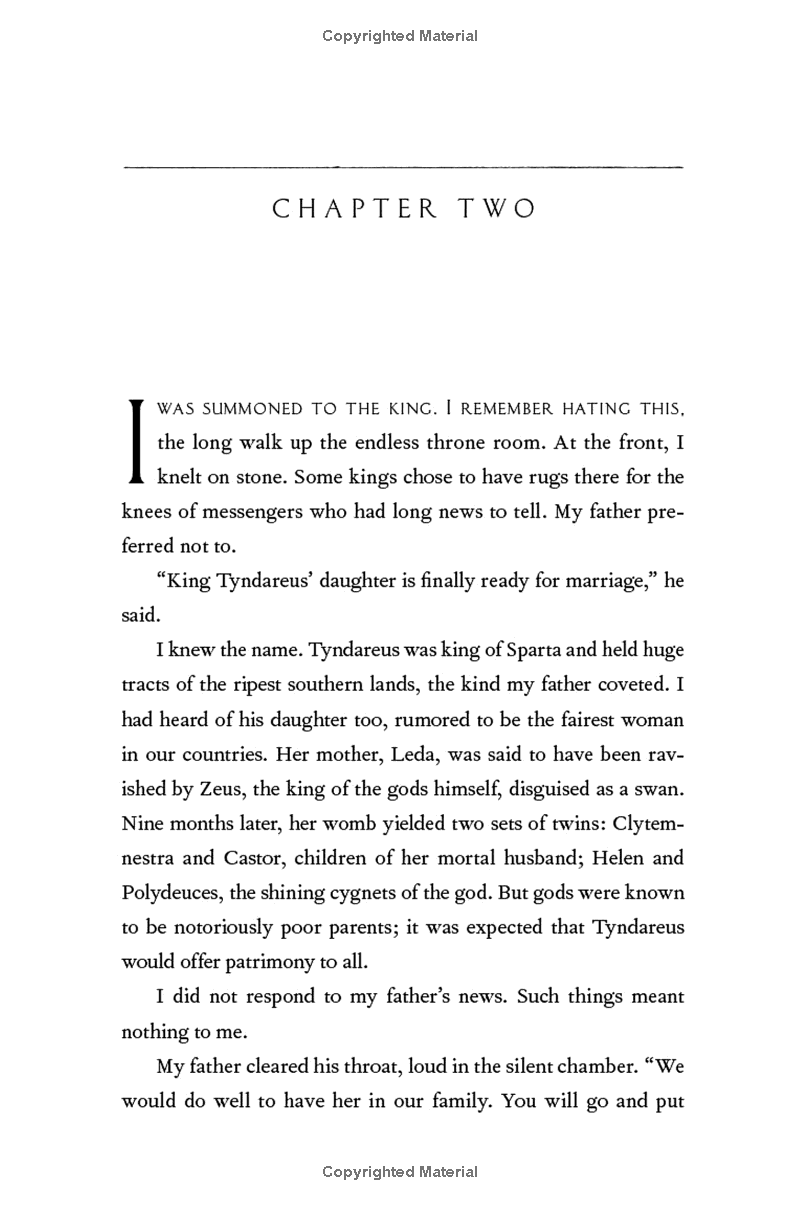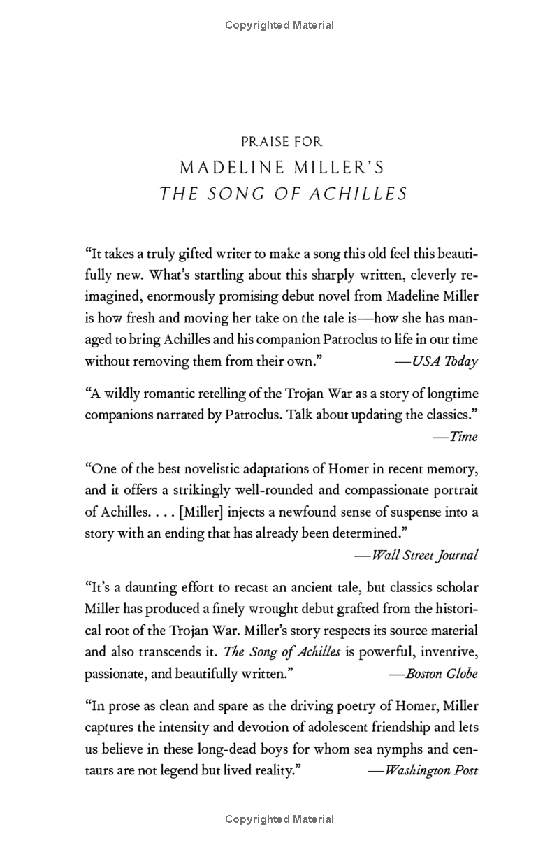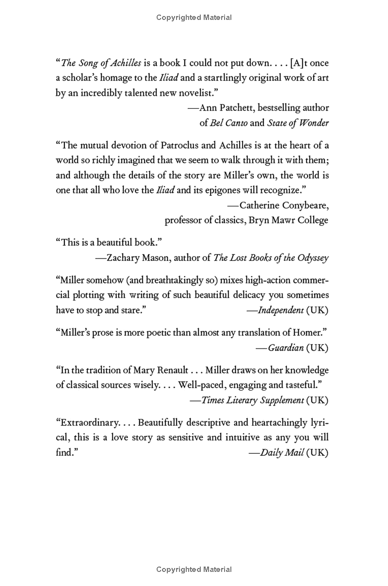"A captivating retelling of The Iliad and events leading up to it through the point of view of Patroclus: it's a hard book to put down, and any classicist will be enthralled by her characterisation of the goddess Thetis, which carries the true savagery and chill of antiquity." -- Donna Tartt, The Times