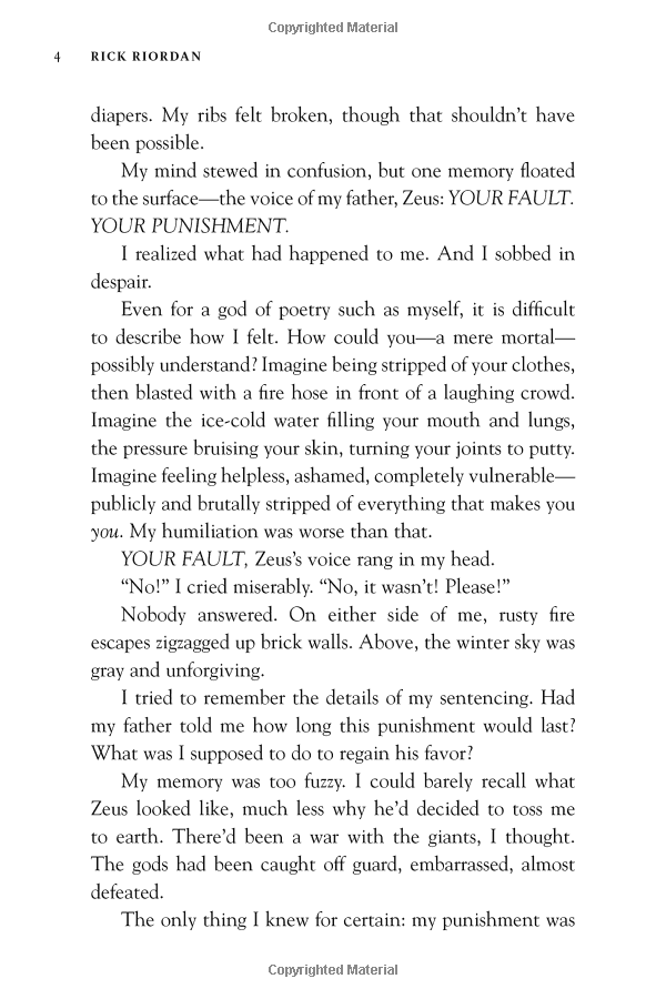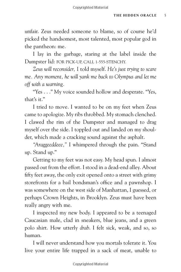 After angering his father Zeus, the god Apollo is cast down from Olympus. Weak and disorientated, he lands in New York City as a regular teenage boy. Now, without his godly powers, the four-thousand-year-old deity must learn to survive in the modern world until he can somehow find a way to regain Zeus's favour.