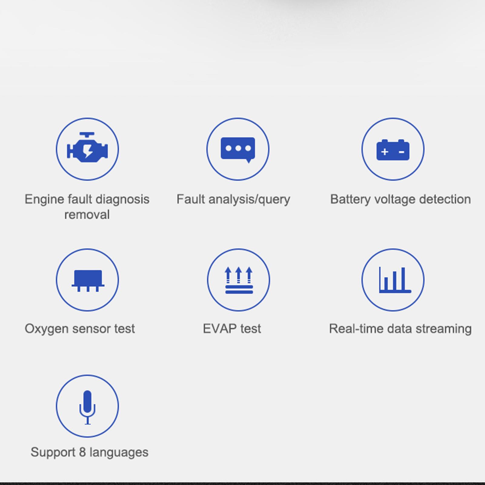 Features:Multi-function: Including engine fault diagnosis removal, fault anlysis/query,battery voltage detection, oxygen sensor test, EVAP test, real-tiime data streaming and support 8 languages.