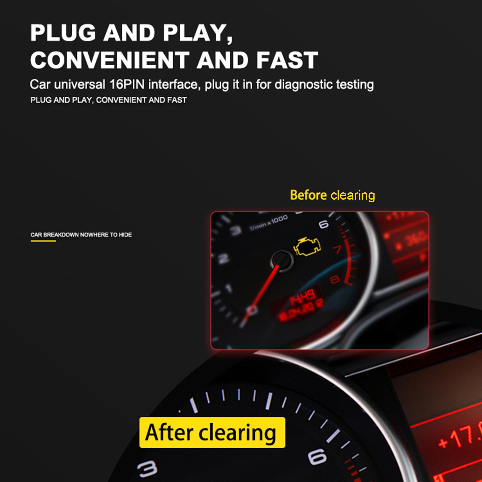 Plug and play: Plug the car universal 16PIN interface in for diagnostic testing, convenienet and fast.