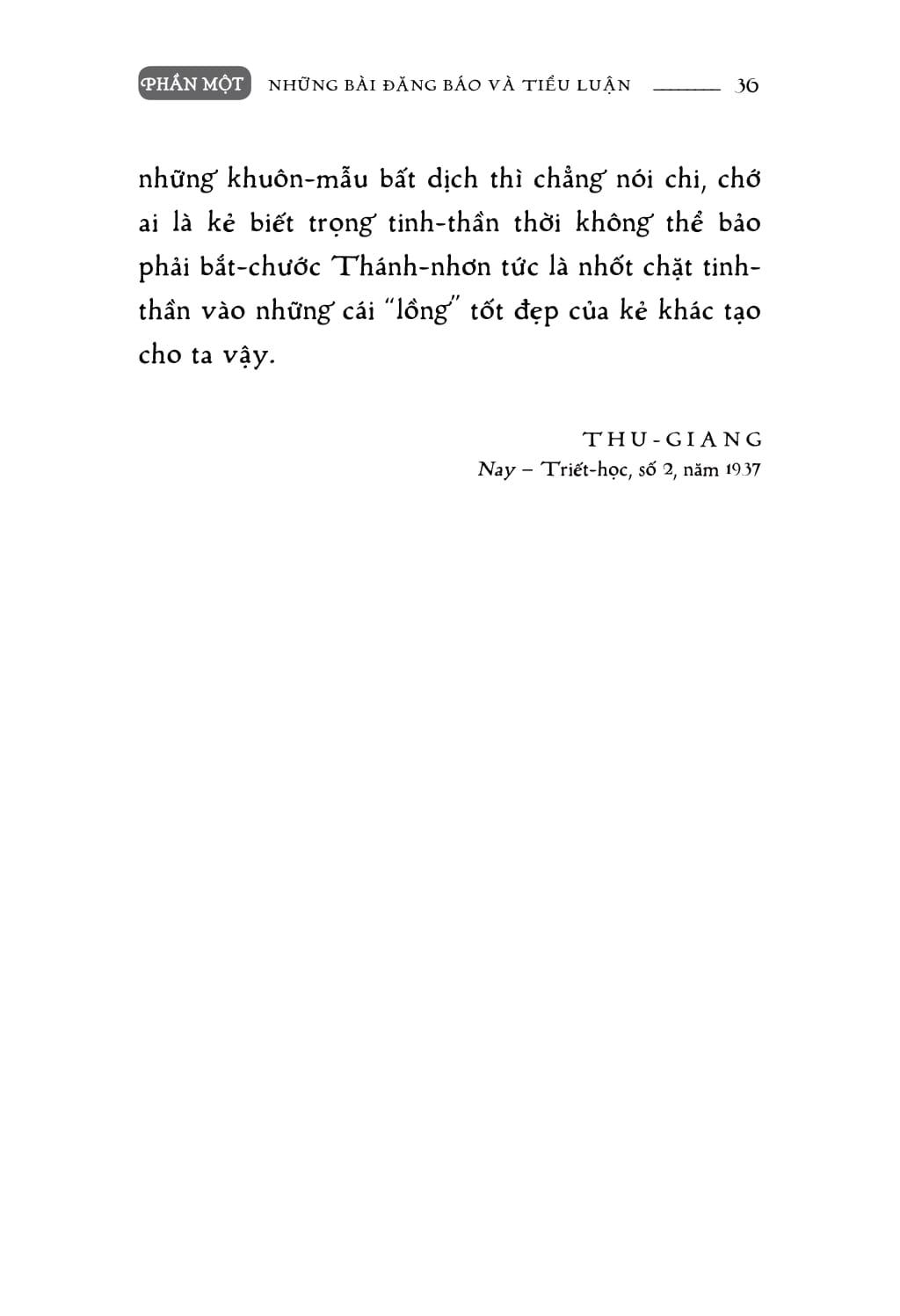 Phần một là tập hợp những bài báo của tác giả đăng trên bán nguyệt san Nay năm 1937 gồm các chủ đề Văn chương, Triết học, Khoa học, Y học và Tâm lý học. Nội dung chính là những bài viết về triết học bàn rộng hơn về những khái niệm mà tác giả đã trình bày trong quyển Toàn chân triết luận in năm 1936.