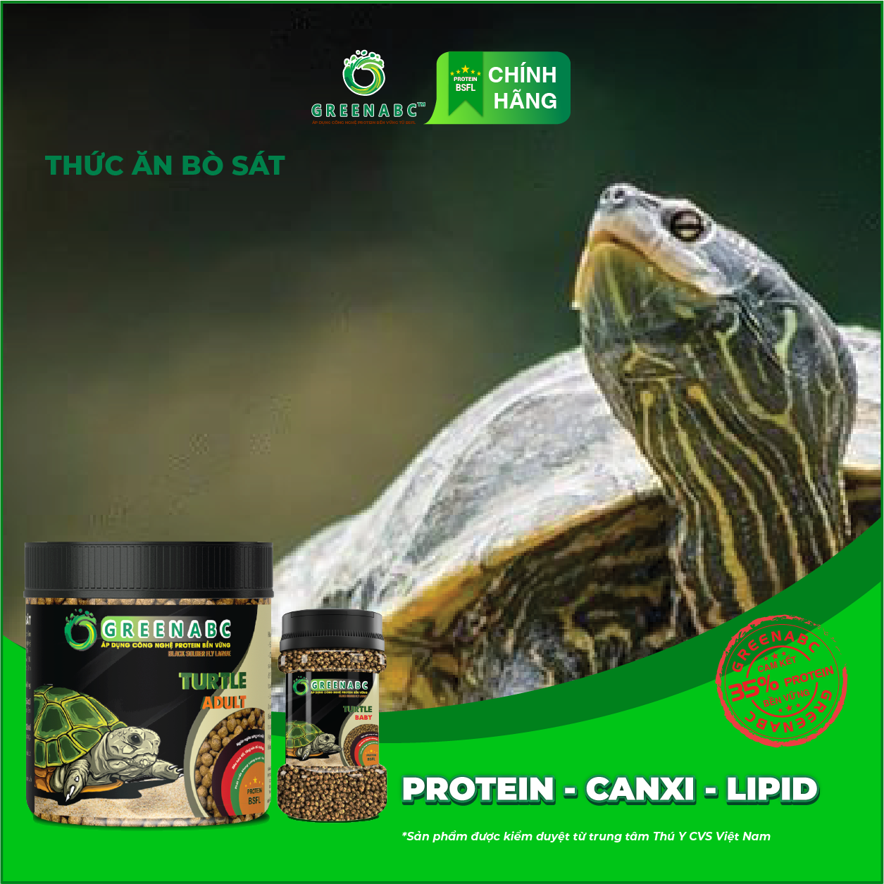 GREENABC là thức ăn bổ dưỡng dành cho RÙA NƯỚC - TURTLE. Đặc biệt sản phẩm GREENABC được sản xuất theo phương pháp Áp dụng công nghệ PROTEIN Bền Vững từ bột đạm G.Meal rất giàu PROTEIN – CANXI – LIPID có trong BSFL*, đã được Mỹ (AAFCO)* và EU chấp nhận đưa vào công thức cho ngành sản xuất thức ăn vật nuôi.