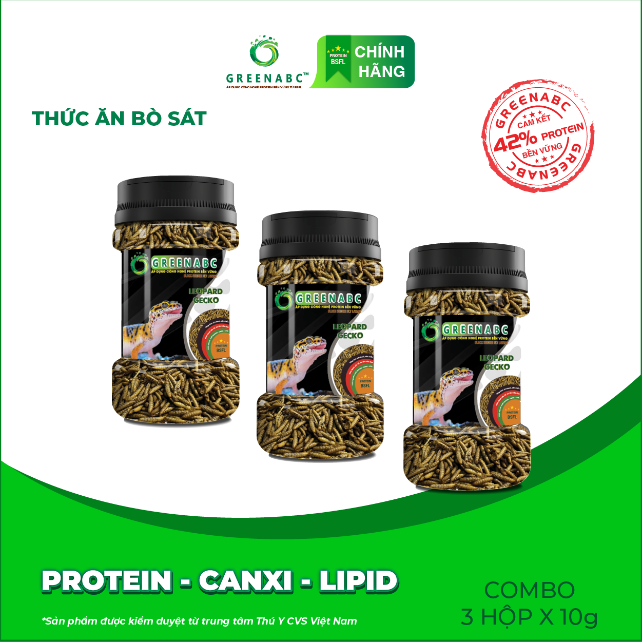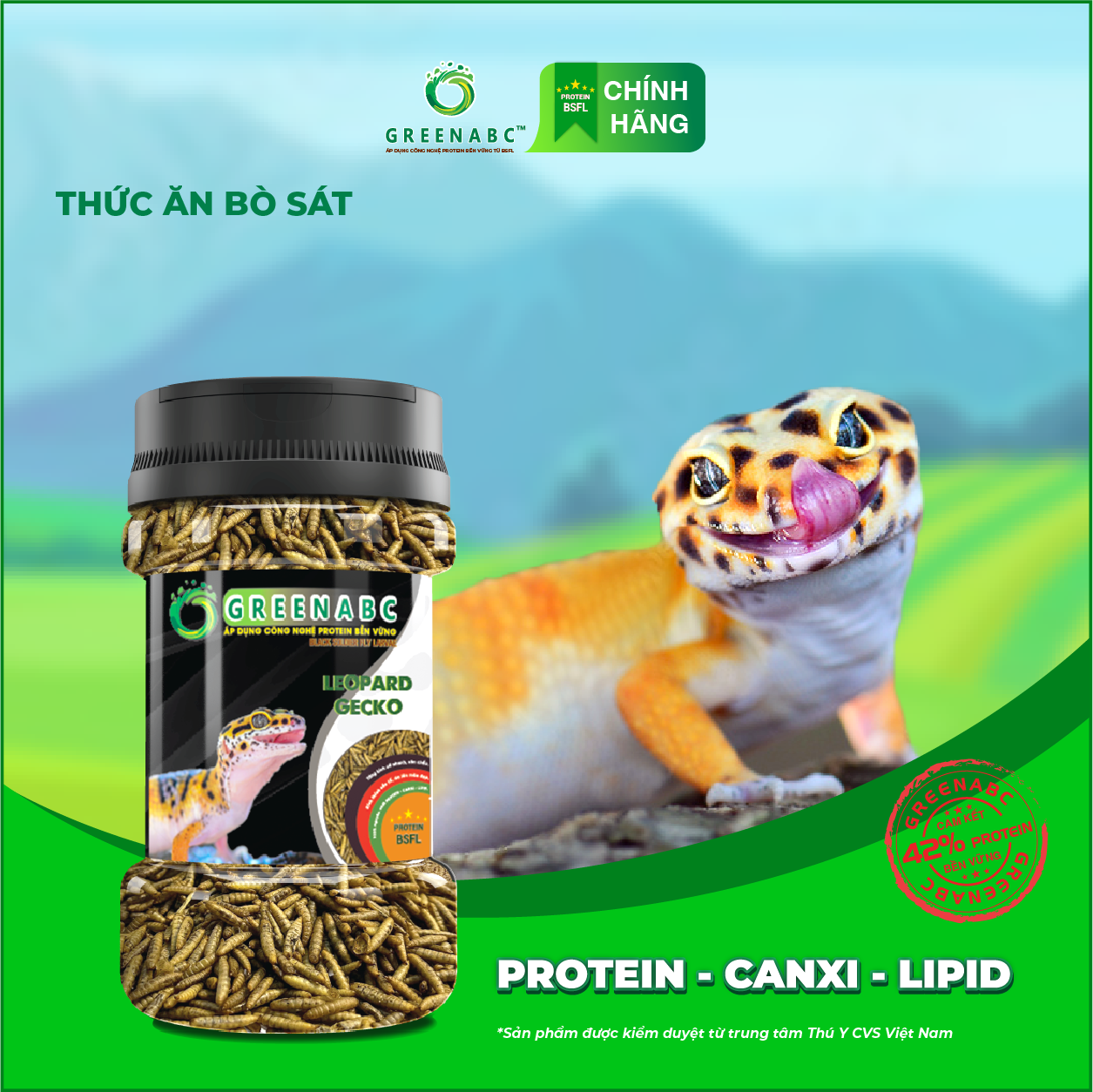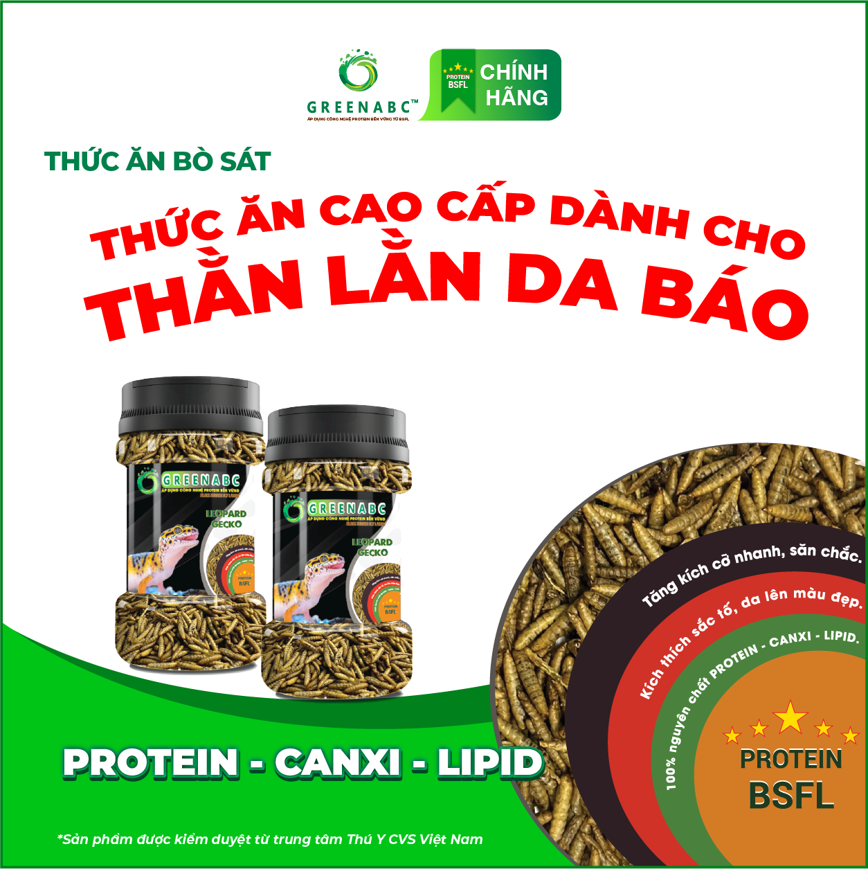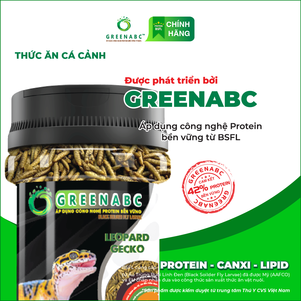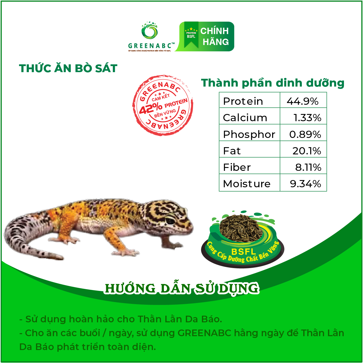 GREENABC là thức ăn bổ dưỡng dành cho THẰN LẰN DA BÁO. Đặc biệt sản phẩm GREENABC được sản xuất theo phương pháp Áp dụng công nghệ PROTEIN bền vững rất giàu PROTEIN – CANXI – LIPID có trong BSFL*, đã được Mỹ (AAFCO)* và EU chấp nhận đưa vào công thức cho ngành sản xuất thức ăn dành cho vật nuôi.