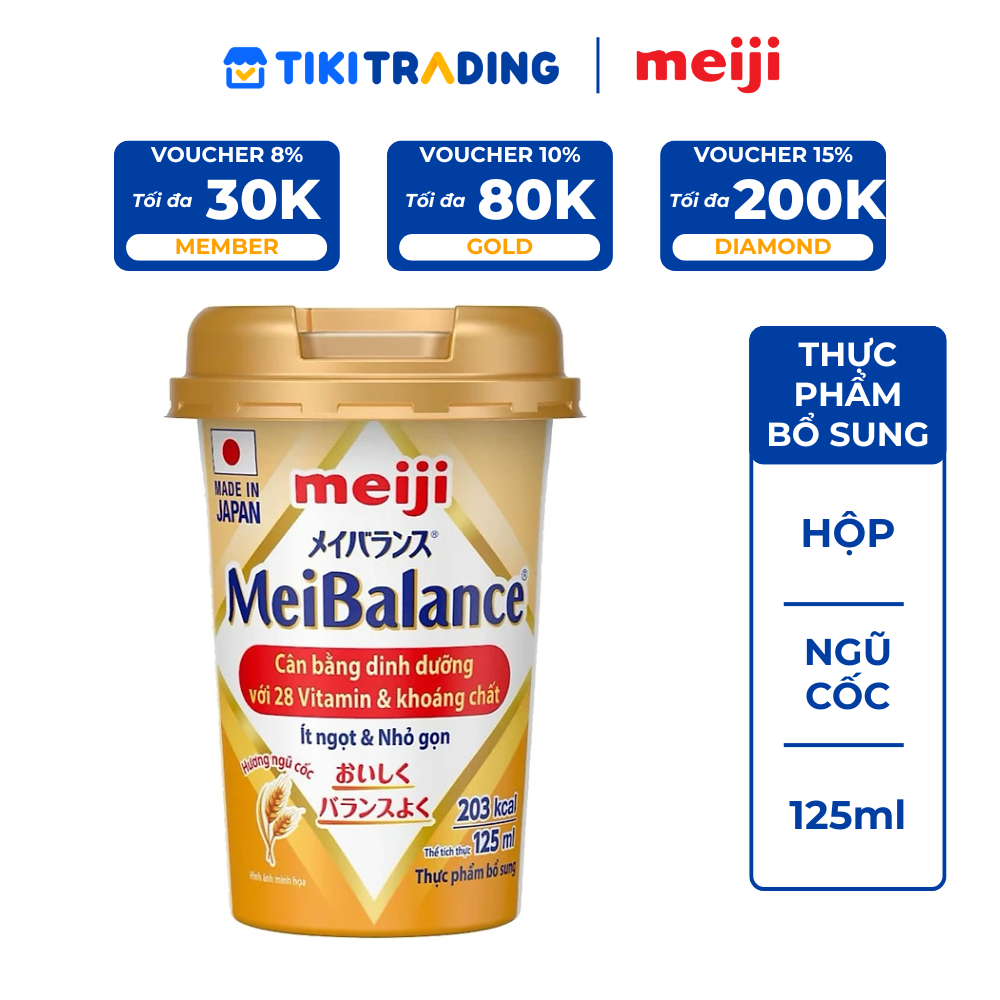 - Thực phẩm bổ sung Meiji MeiBalance hộp 125 ml chứa lượng đạm tốt gấp 1.7 lần so với sữa tươi thông thường, mang đến cho cơ thể nhiều loại axit amin cần thiết giúp tăng cường hồi phục sức khỏe và tăng sức đề kháng.