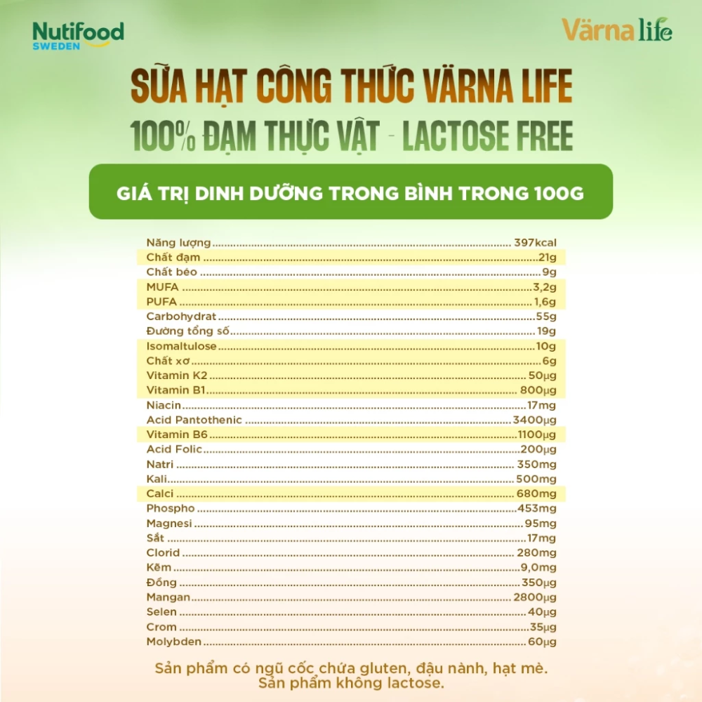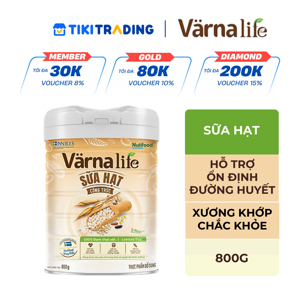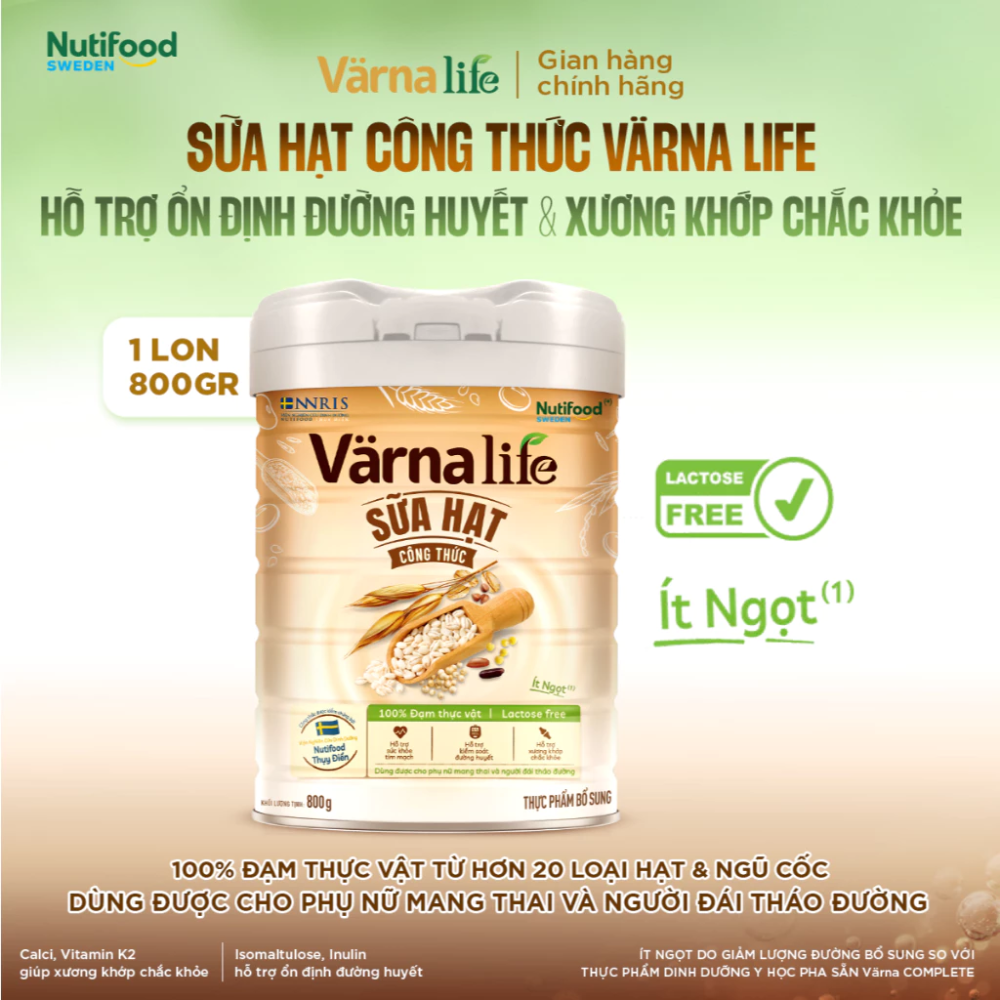 Sữa hạt Sữa hạt công thức Varna Life chứa hơn 20 loại hạt và ngũ cốc, cung cấp 100% đạm thực vật và dưỡng chất thiết yếu như Isomaltulose, chất xơ từ hạt ngũ cốc, Inulin giúp kiểm soát đường huyết và cân nặng; Calci cho xương chắc khỏe, đạm đậu nành và chất béo MUFA, PUFA giảm cholesterol xấu, tốt cho tim mạch.