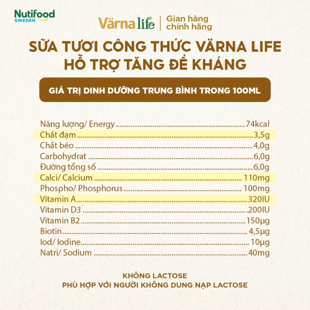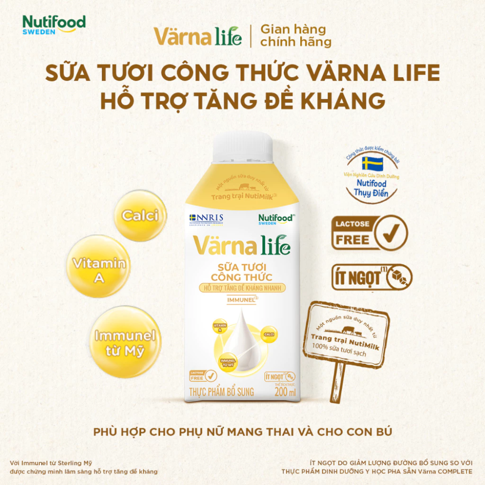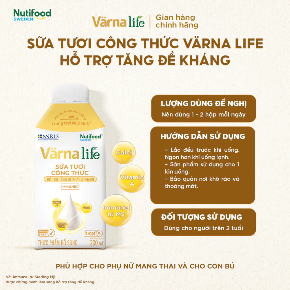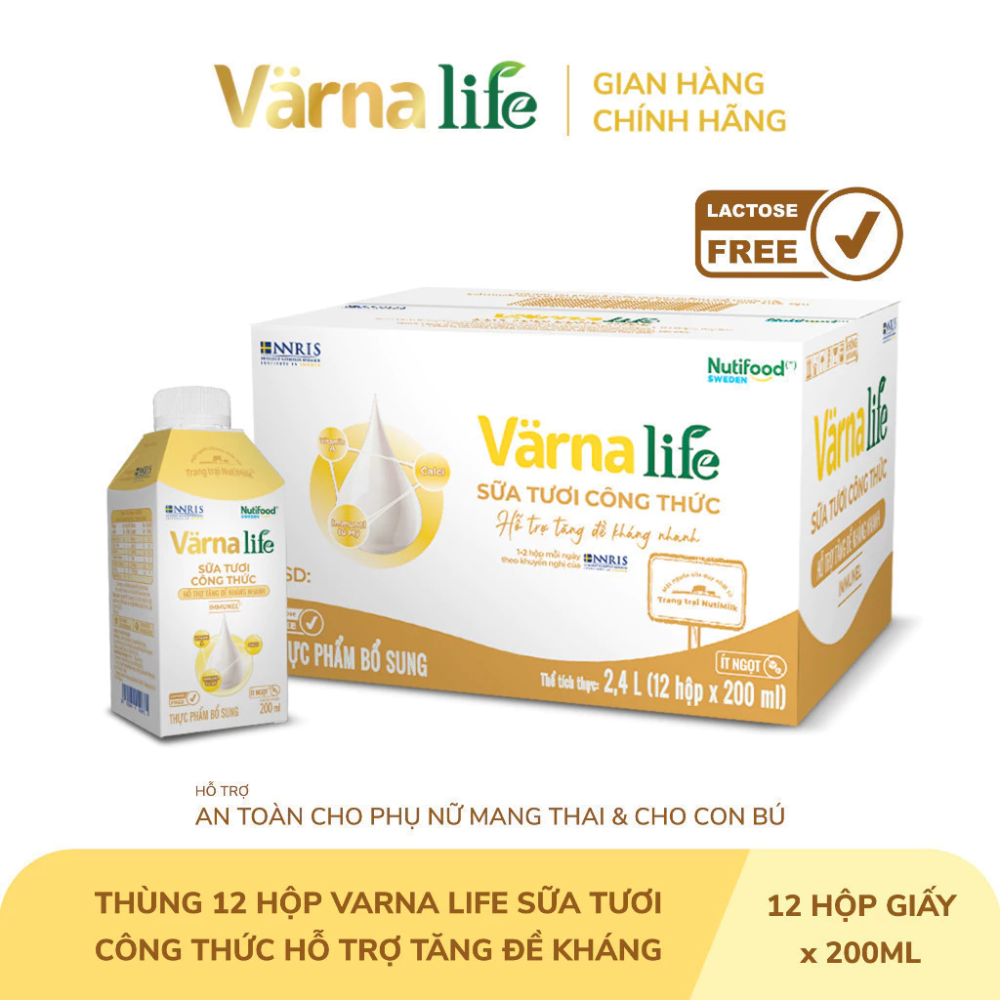 Thông số kỹ thuật Thùng Thực phẩm bổ sung Värna Life sữa tươi công thức (Vàng) (12 hộp x 200ml)