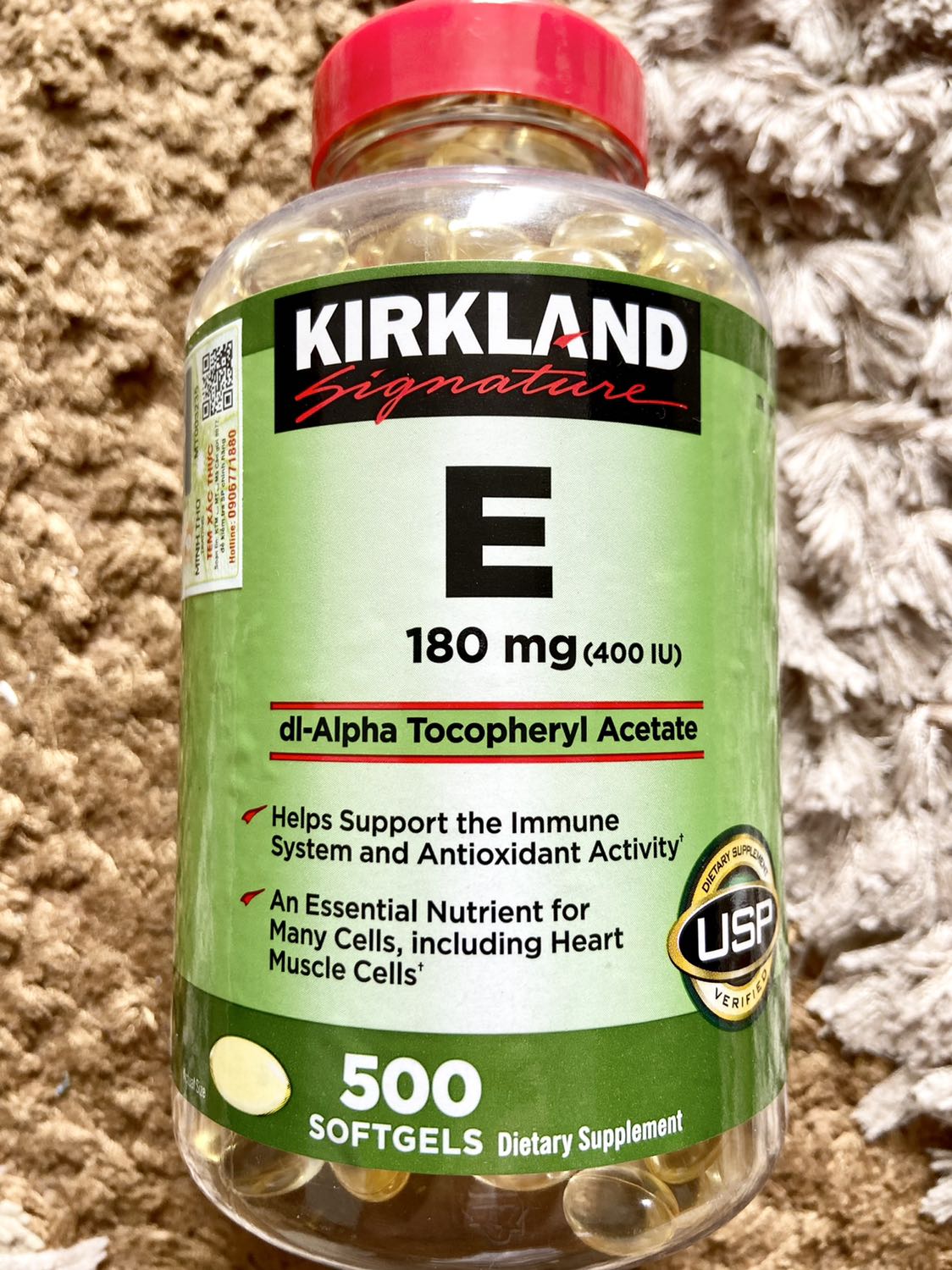 - Vitamin E Mỹ Kirkland Signature Vitamin E 180mg (400 IU) 500 Viên giúp điều trị và duy trì sức khỏe và làm đẹp da và tăng cường sức khỏe, hỗ trợ sức khỏe của hệ tuần hoàn qua việc ngăn ngừa quá trình oxi hóa cholesterol LDL, các tình trạng gây tổn thương tế bào.