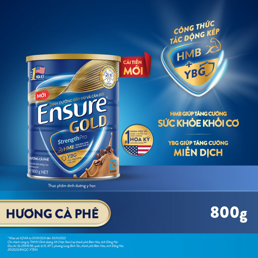 - Sữa Bột Abbott Ensure Gold Coffe cung cấp đầy đủ vitamin và khoáng chất rất thích hợp khi cần phục hồi sức khỏe nhanh. Bạn cũng có thể dùng sữa để bổ sung vào khẩu phần ăn khi có nhu cầu tăng thêm về năng lượng và chất đạm, hoặc để duy trì tình trạng dinh dưỡng tốt Sữa Bột Abbott Ensure Gold Coffee (HMB) có thể thay thế hoàn toàn hay một phần bữa ăn để duy trì hoặc tăng cường sức khỏe cho bạn và gia đình.