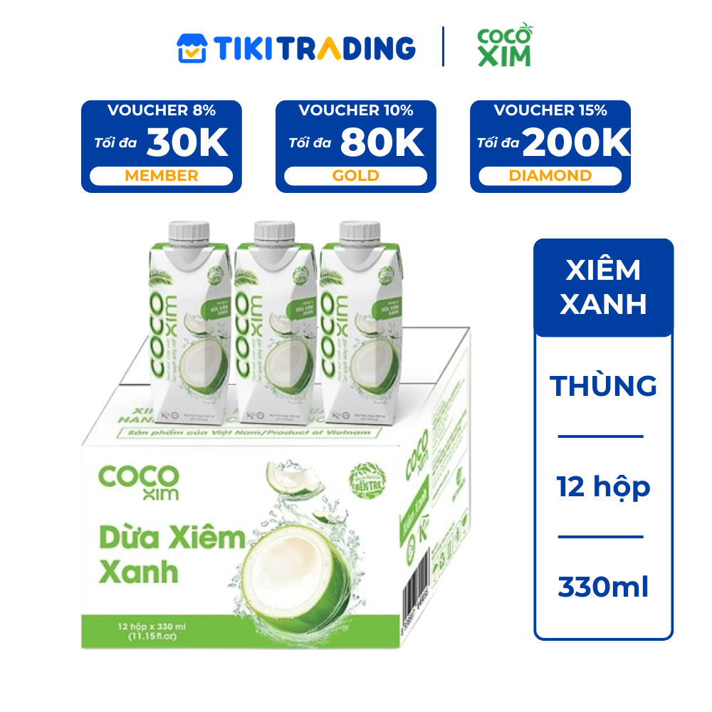 - Thùng 12 Hộp Nước Dừa Cocoxim Xanh (330ml / Hộp) được làm từ 100% nước dừa nguyên chất tại "Thủ phủ dừa" Bến Tre cùng hương vị ngọt dịu tự nhiên.