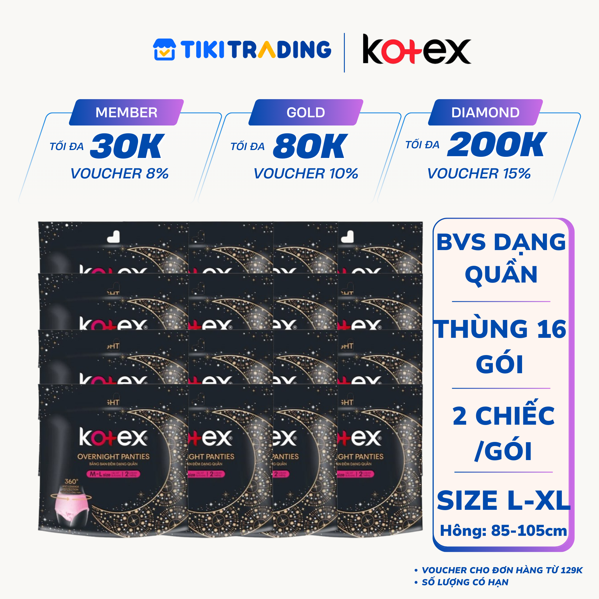Thông số kỹ thuật (Thùng 16 gói) Băng vệ sinh Kotex ban đêm dạng quần cỡ M/L và L/XL 2 quần/1 gói