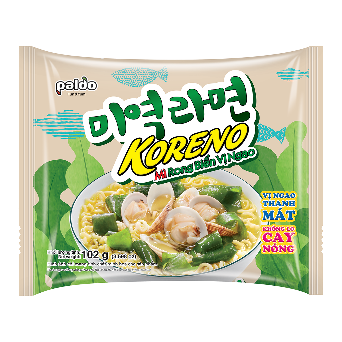 - Mì Koreno Rong Biển Vị Ngao với vị ngao kết hợp rong biển ngon lành, dễ ăn, mang hương vị Hàn Quốc. Sản phẩm được chế biến theo công nghệ Hàn Quốc giúp cho sợi mì mềm dai hòa quyện cùng công thức độc đáo mang hương vị đậm đà từ rong biển và ngao thơm cho nước dùng thơm ngon đến khó cưỡng.