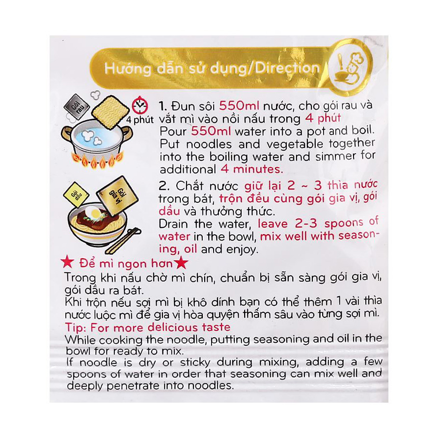 Hướng dẫn nấu: Áp dụng cho 1 gói lẻ 115g
