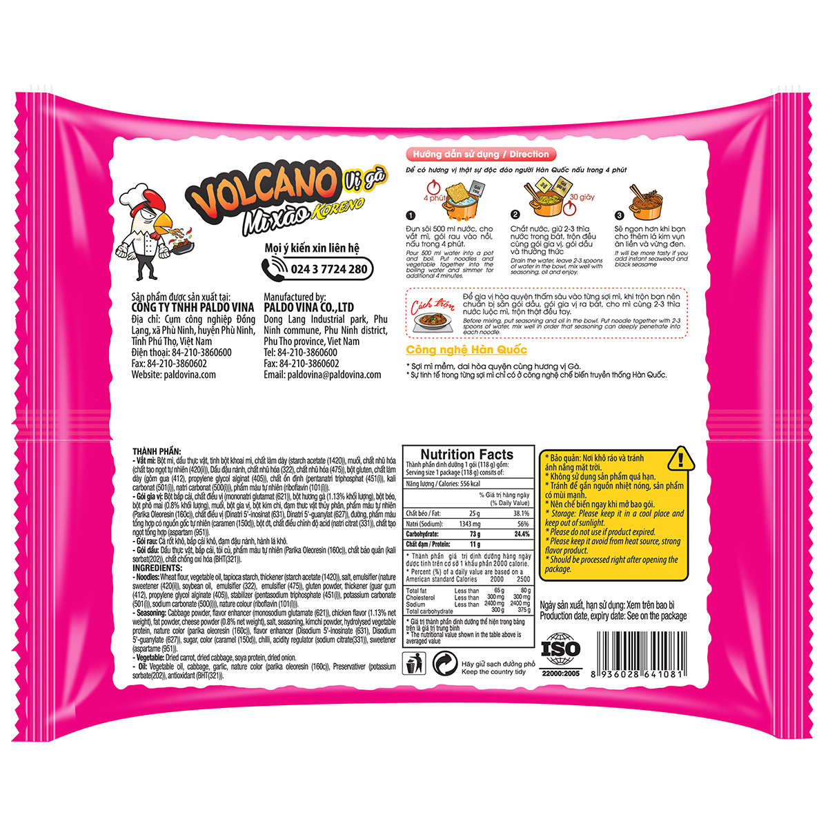 - Mỳ Xào Vị Gà Koreno Volcano có thành phần nguyên liệu an toàn cho sức khỏe. Hương vị thơm ngon, hấp dẫn. Đóng gói tiện lợi, hợp vệ sinh.