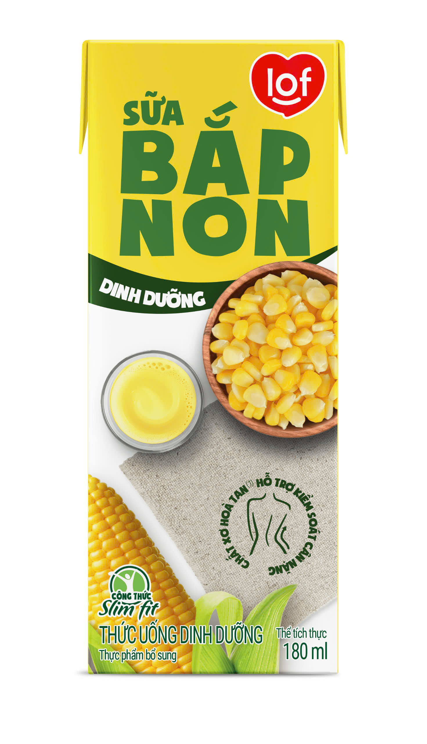 LOF gửi trọn dinh dưỡng thiên nhiên trong từng giọt sữa thơm ngon được tách từ những trái bắp non 100% giòn ngọt. Công thức Slimfit cùng Vitamin A, B1, B3, B6, đặc biệt bổ sung CHẤT XƠ giúp hỗ trợ tiêu hóa, kiểm soát cân nặng. Thức uống dinh dưỡng sữa bắp non LOF thơm ngon, thanh mát. CHUẨN 3 KHÔNG Không chất bảo quản Không màu tổng hợp Không chất tạo ngọt tổng hợp Thành phần: Nước, bắp non (100 g/L), đường kính trắng, bột sữa (28 g/L), chất béo thực vật, maltodextrin, chất xơ hòa tan (1), chất ổn định (INS 471, INS 466, INS 460(i)), hương liệu tổng hợp (hương bắp), phẩm màu tự nhiên (INS 100(i)), muối, vitamin (A, B1, B3, B6). Sản phẩm có chứa sữa. Hướng dẫn sử dụng: Dùng được cho người ăn chay. Dùng từ 1 đến 2 hộp mỗi ngày. Lắc đều trước khi sử dụng. Sản phẩm cho 1 lần sử dụng. Hướng dẫn bảo quản: Bảo quản nơi khô ráo và thoáng mát. Tránh ánh nắng trực tiếp.Giá sản phẩm trên Tiki đã bao gồm thuế theo luật hiện hành. Bên cạnh đó, tuỳ vào loại sản phẩm, hình thức và địa chỉ giao hàng mà có thể phát sinh thêm chi phí khác như phí vận chuyển, phụ phí hàng cồng kềnh, thuế nhập khẩu (đối với đơn hàng giao từ nước ngoài có giá trị trên 1 triệu đồng).....