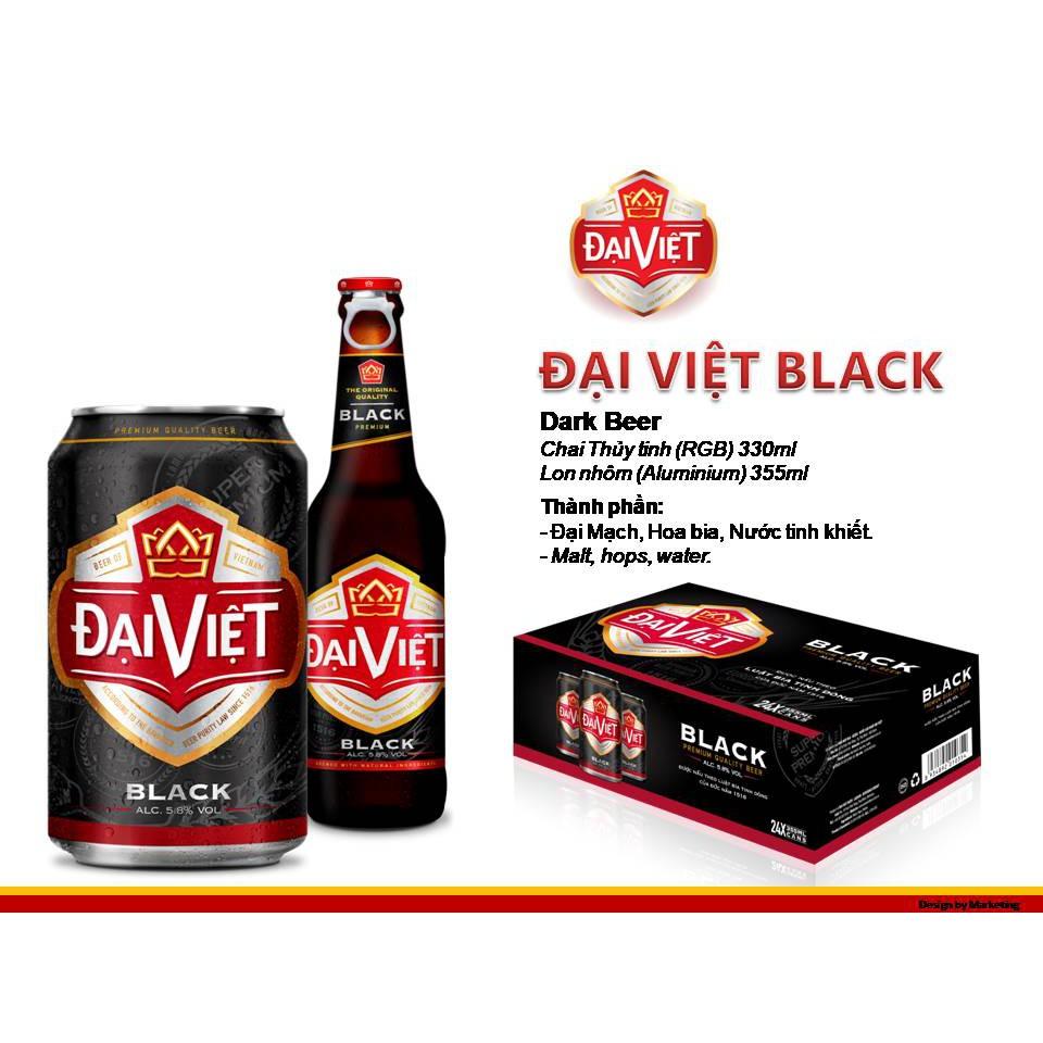 Sản phẩm được sản xuất theo tiêu chuẩn châu Âu với quy trình sản xuất hiện đại, đảm bảo vệ sinh an toàn thực phẩm. Màu bia nâu đen độc đáo hoà cùng với lớp bọt trắng muốt, mịn màng của sản phẩm là minh chứng cho một loại bia tuyệt hảo. Bia Black Đại Việt có hương thơm và vị đắng đặc trưng mang hương vị Đức tuyệt đỉnh. Thành phần: - Đại Mạch, Hoa bia, Nước tinh khiết.