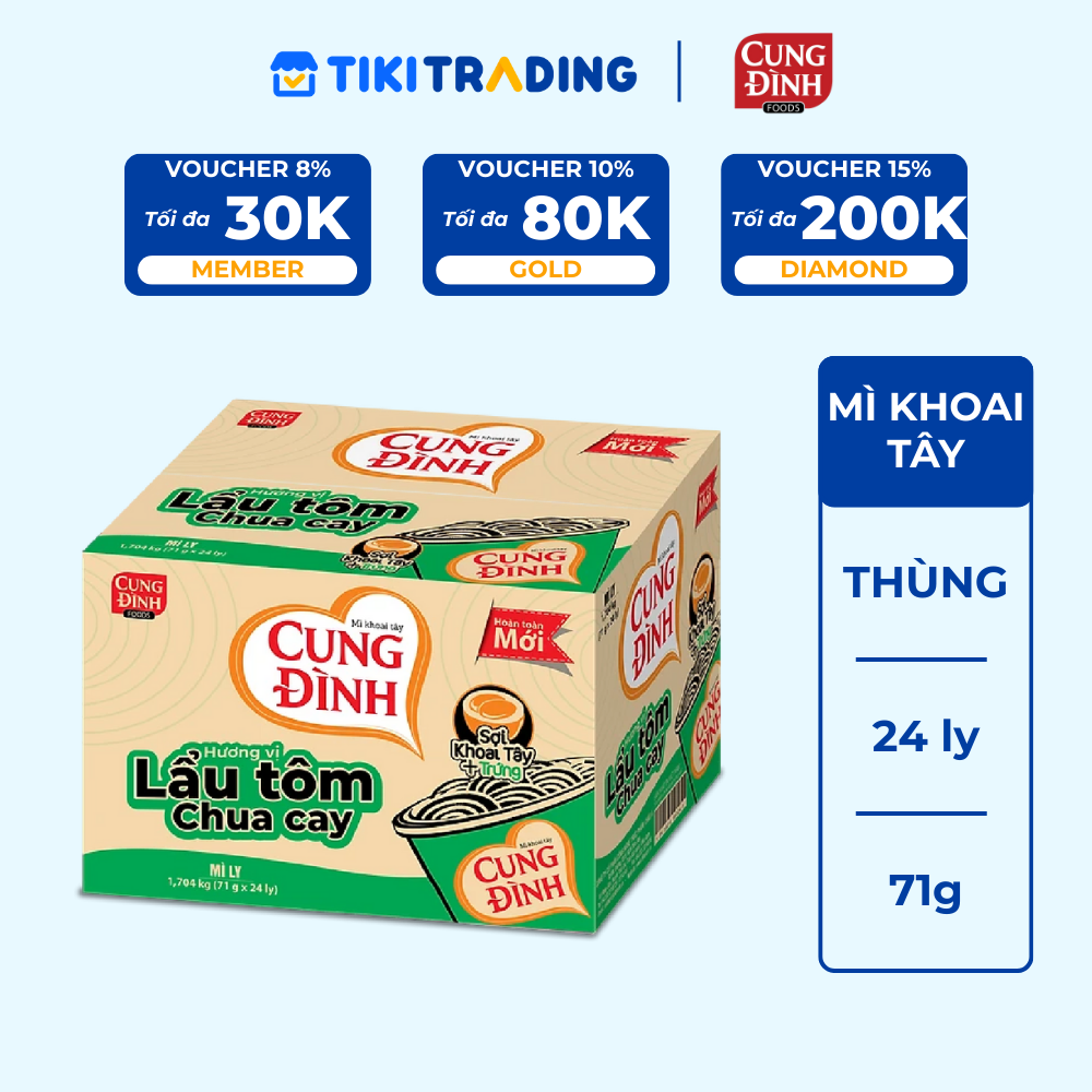 Thùng 24 Ly Mì Khoai Tây Cung Đình Hương Vị Lẩu Tôm Chua Cay - Mì ăn liền là một trong những thực phẩm đóng vai trò không nhỏ trong bữa ăn của mỗi gia đình Việt. Sản phẩm mì ăn liền từ rất lâu đã được xem như "vị cứu tinh" của các bà nội trợ trong những bữa sáng vội vã hay những ngày bận rộn, mệt mỏi, không có thời gian nấu nướng. Sản phẩm dạng ly với cách chế biến đơn giản, cho phép bạn có thể thưởng thức món mì thơm ngon, nóng sốt chỉ sau vài phút chờ mì chín.