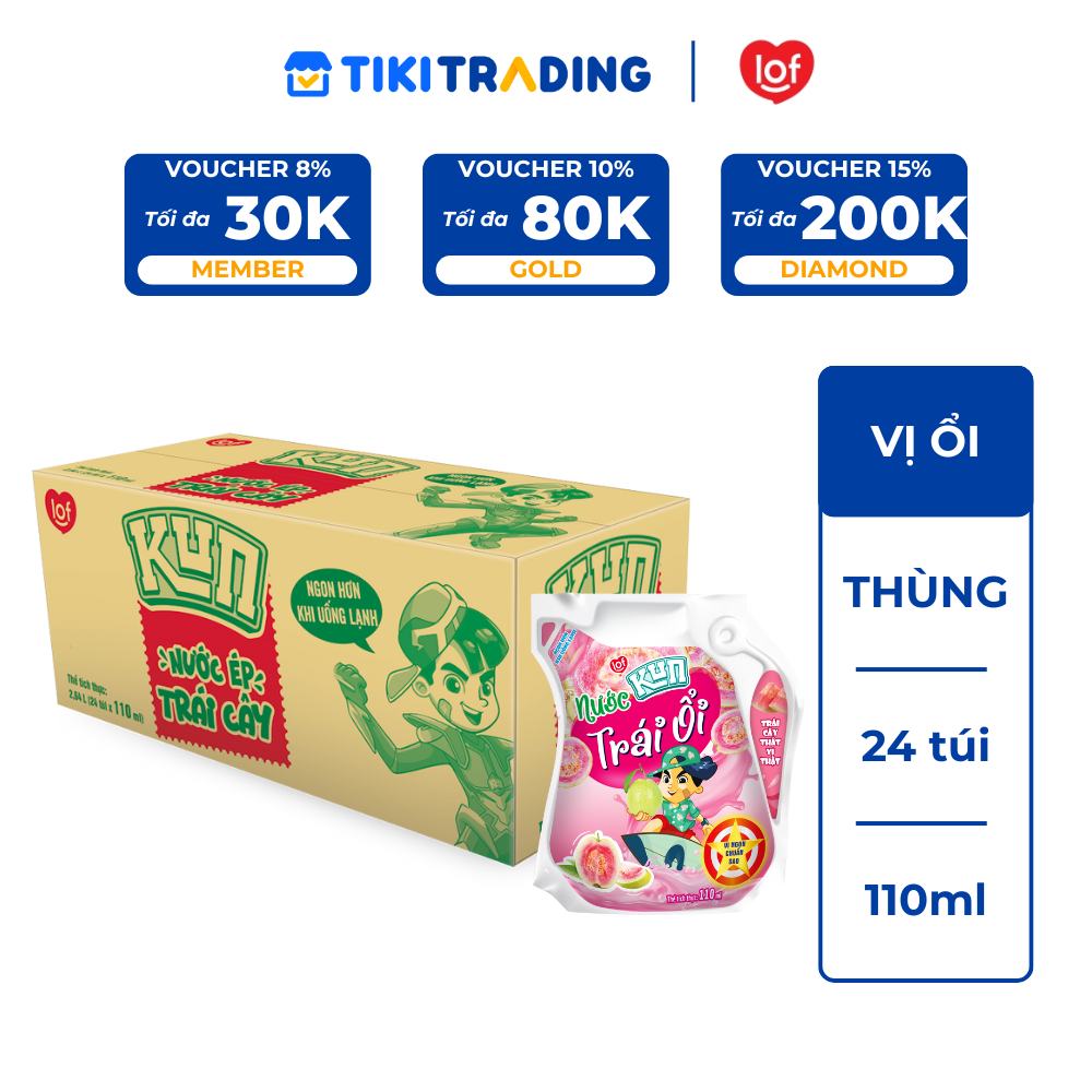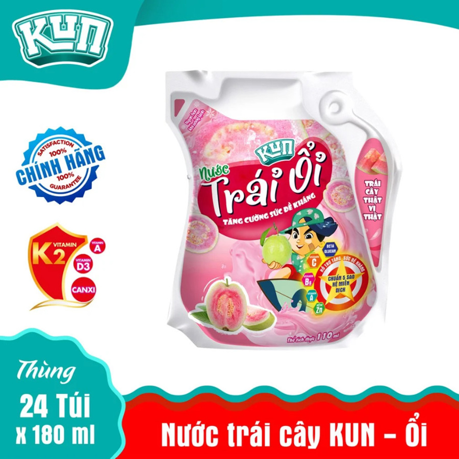 KUN_Nước trái cây ổi thùng 24 túi x 110mlNước Trái Ổi KUN đáp ứng chuẩn 3 không:• Không Chất Bảo Quản• Không Màu Tổng Hợp• Không Chất Tạo Ngọt Tổng HợpGiá sản phẩm trên Tiki đã bao gồm thuế theo luật hiện hành. Bên cạnh đó, tuỳ vào loại sản phẩm, hình thức và địa chỉ giao hàng mà có thể phát sinh thêm chi phí khác như phí vận chuyển, phụ phí hàng cồng kềnh, thuế nhập khẩu (đối với đơn hàng giao từ nước ngoài có giá trị trên 1 triệu đồng).....