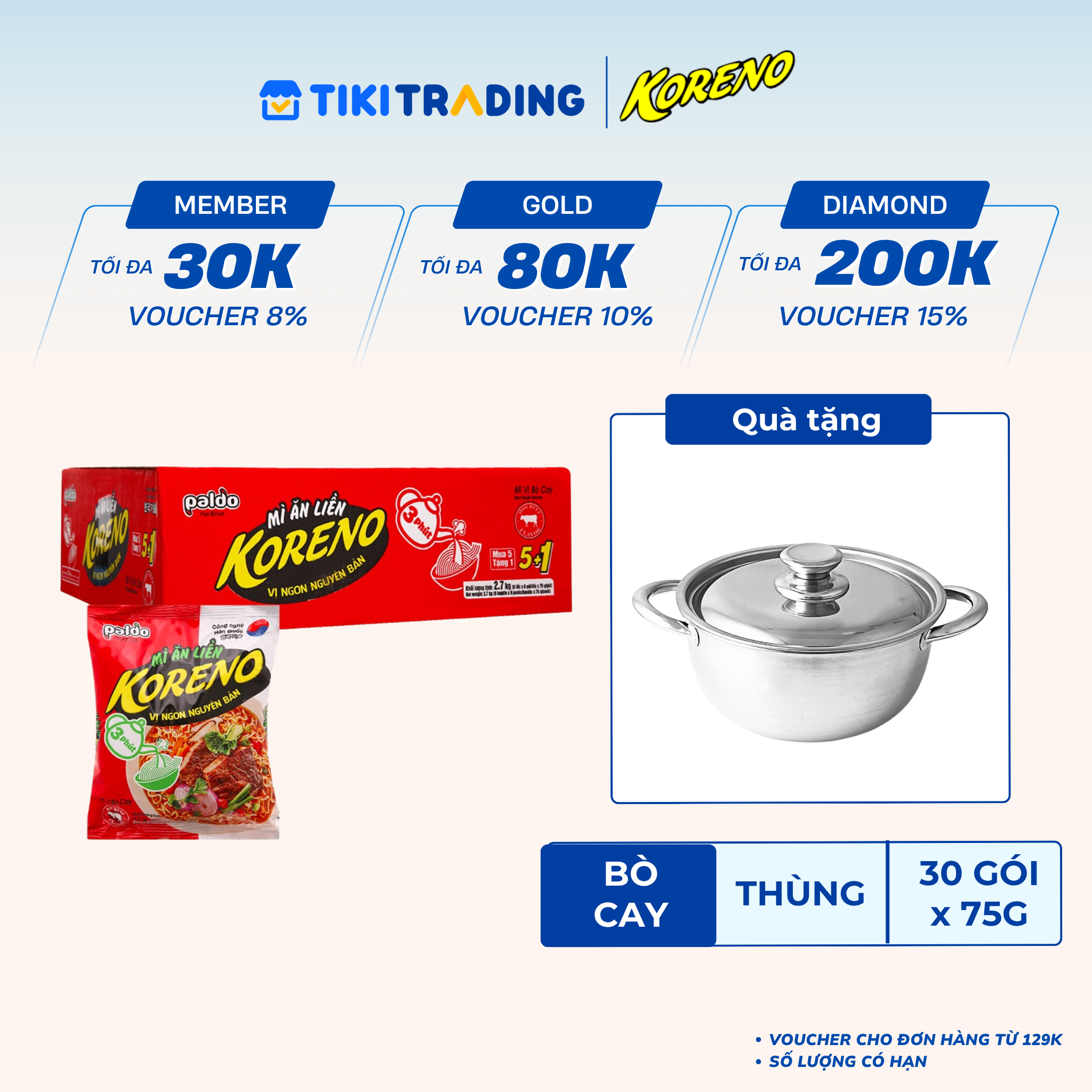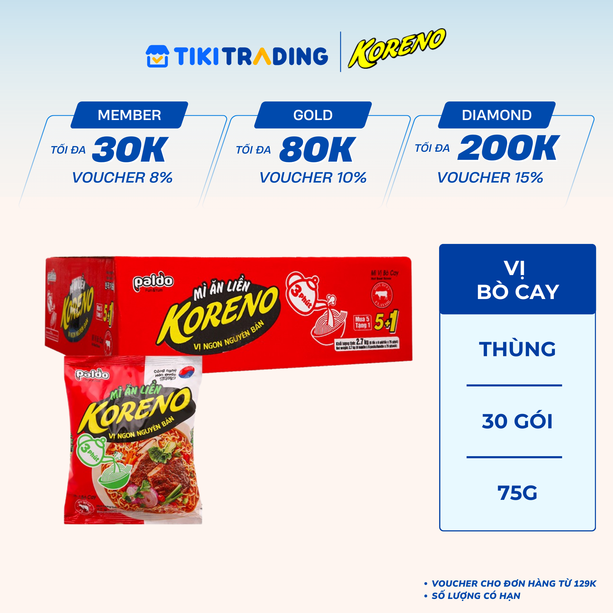Thông số kỹ thuật Thùng 30 Gói Mì Ăn Liền Koreno Vị Bò Cay 75g