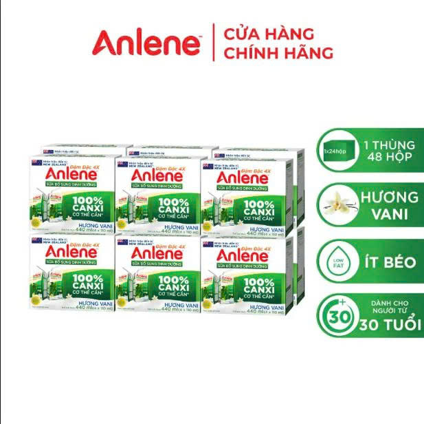 - Thùng 48 Hộp Sữa Anlene Đậm Đặc 4X Ít Béo Hương Vani (12 x 4 x 125 ml) cung cấp các dưỡng chất như: chất đạm sữa chất lượng cao, có chứa các acid amin thiết yếu cho xương các khoáng chất như Canxi, Phốt Pho, Magie, Kẽm, các vitamin như A, C, D3 và các vitamin nhóm B.