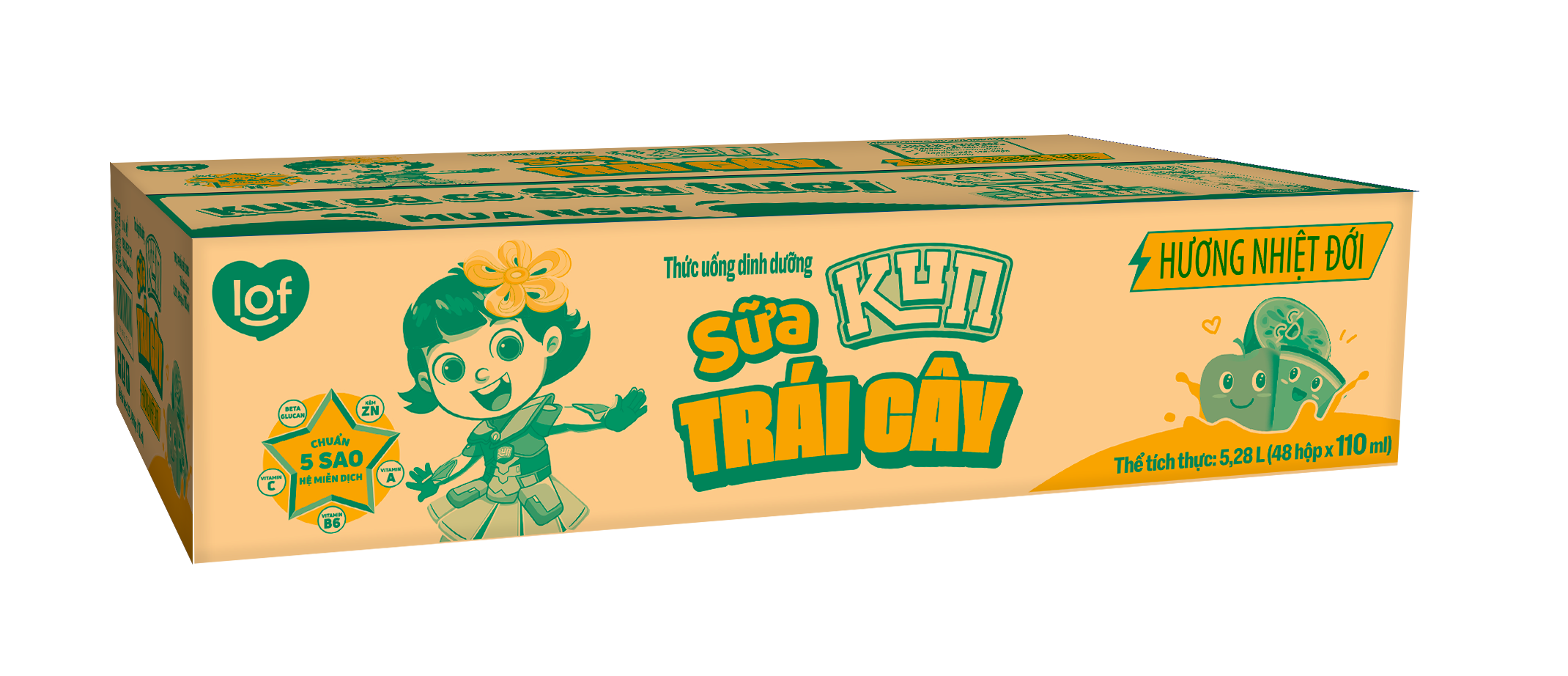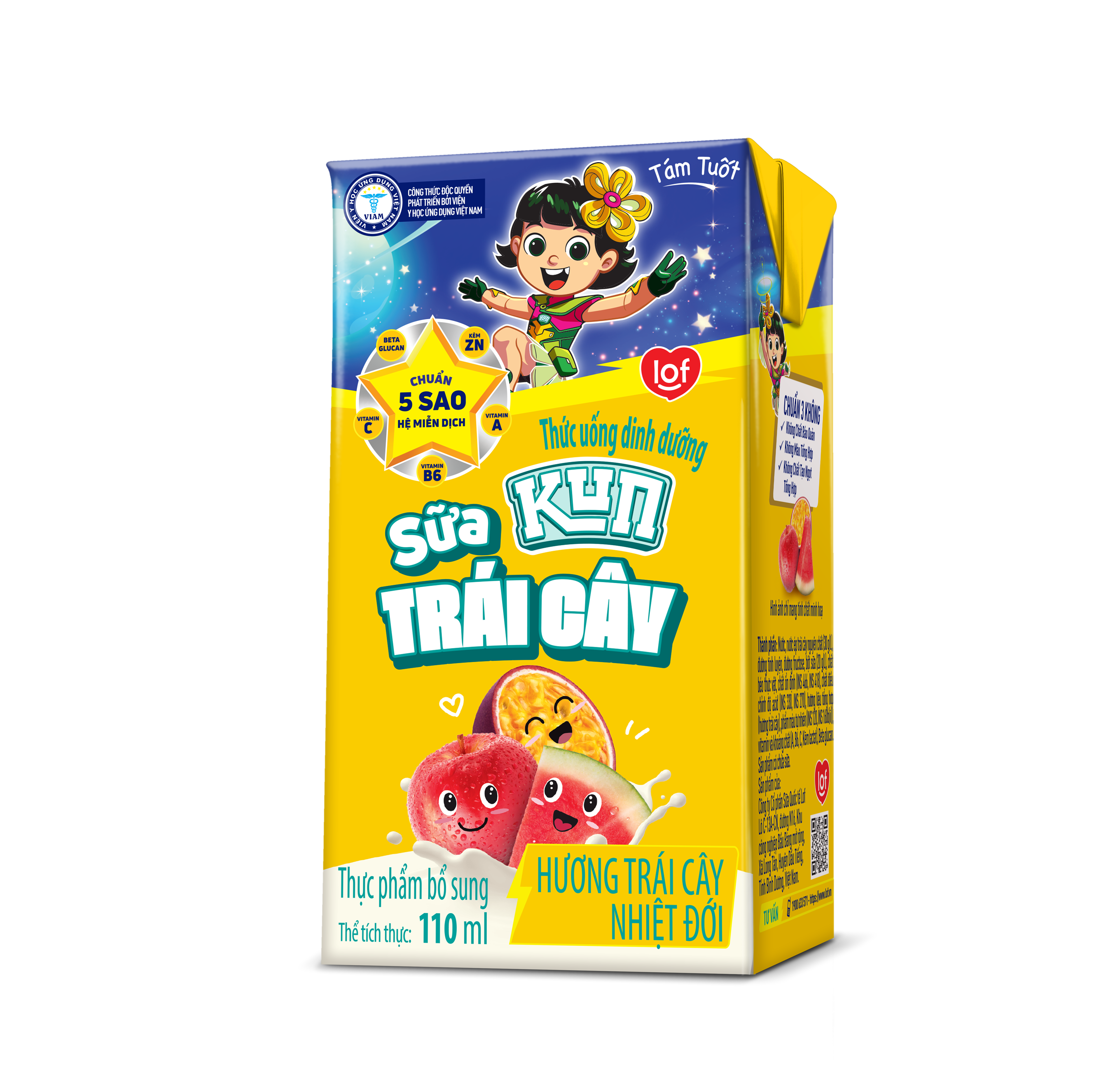 Sữa trái cây Kun với bộ công thức chuẩn 5 sao hệ miễn dịch – được phát triển độc quyền bởi Viện y học Việt Nam VIAM , đặc biệt hỗ trợ đề kháng nhờ thành phần Beta Glucan và các loại Vitamin C, B6, A, giúp bé khỏe mạnh mỗi ngày. • Beta Glucan: Được chiết xuất từ nấm men, hỗ trợ tăng cường Hệ miễn dịch. • Vitamin C hỗ trợ tăng Sức đề kháng. • Vitamin B6 hỗ trợ Hệ thần kinh. • Vitamin A hỗ trợ sáng mắt. Kẽm hỗ trợ Trí Não Đáp ứng chuẩn 3 không: • Không Chất Bảo Quản • Không Màu Tổng Hợp • Không Chất Tạo Ngọt Tổng Hợp Nước, nước ép trái cây nguyên chất (30 g/L), đường tinh luyện, đường fructose, bột sữa (20 g/L), chất béo thực vật, chất ổn định (INS 466, INS 418), chất điều chỉnh độ acid (INS 330, INS 270), hương liệu tổng hợp (hương trái cây), phẩm màu tự nhiên (INS 120, INS 160b(ii)), vitamin và khoáng chất (A, B6, C, Kẽm lactat), Beta glucan. Sản phẩm có chứa sữa. ĐỐI TƯỢNG SỬ DỤNG Sử dụng cho trẻ em từ 2 tuổi trở lên. Dùng 2 đến 3 hộp mỗi ngày. Lắc đều trước khi sử dụng. Sản phẩm cho 1 lần sử dụng. Bảo quản nơi khô ráo và thoáng mát, tránh ánh nắng trực tiếp. Hiện tượng thay đổi màu sắc và lắng đọng tự nhiên không làm ảnh hưởng đến chất lượng sản phẩmGiá sản phẩm trên Tiki đã bao gồm thuế theo luật hiện hành. Bên cạnh đó, tuỳ vào loại sản phẩm, hình thức và địa chỉ giao hàng mà có thể phát sinh thêm chi phí khác như phí vận chuyển, phụ phí hàng cồng kềnh, thuế nhập khẩu (đối với đơn hàng giao từ nước ngoài có giá trị trên 1 triệu đồng).....
