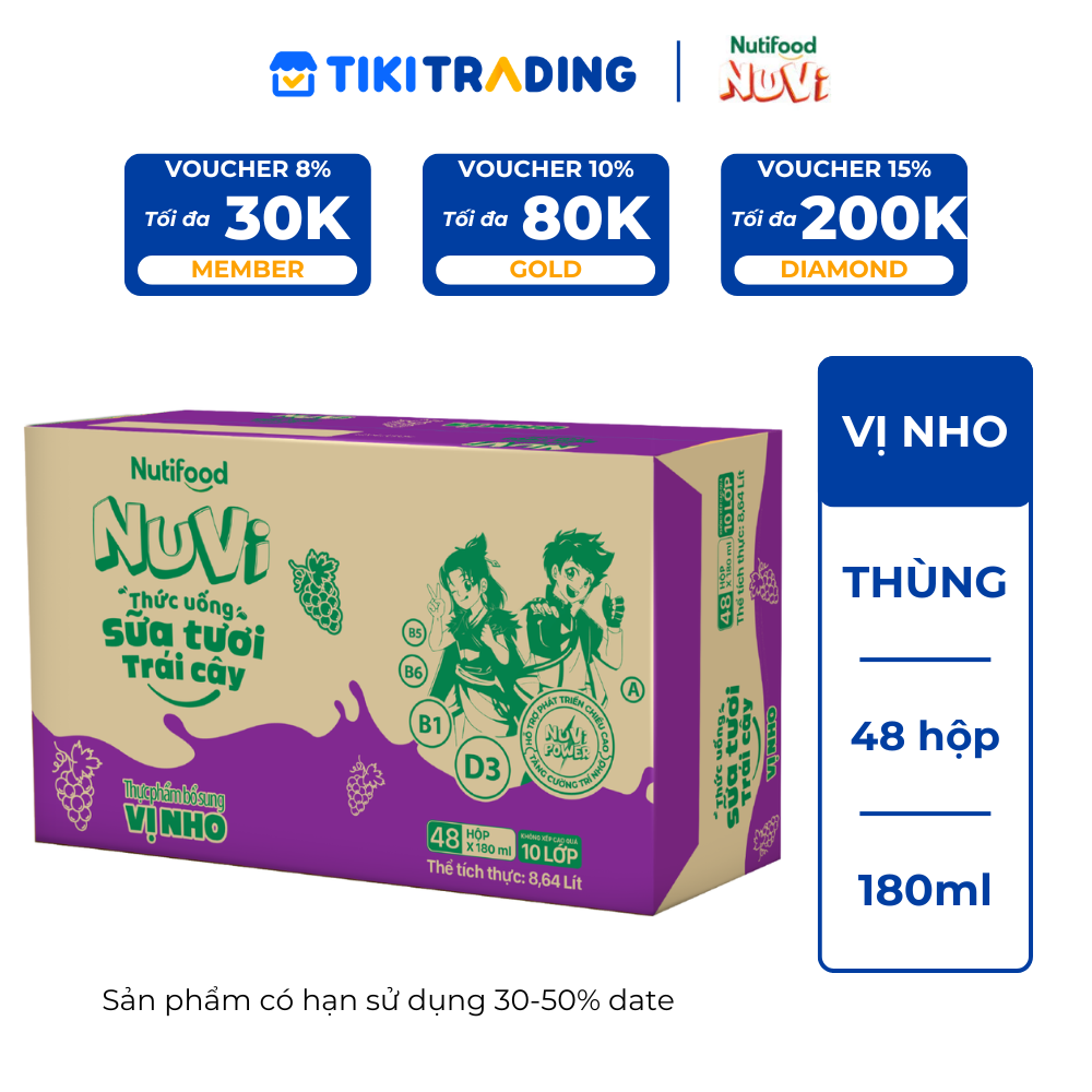Thông số kỹ thuật Thùng 48 hộp Thức Uống Sữa Tươi Trái Cây Tươi NuVi Vị Nho 180ml - Tăng Cường Chiều Cao, Phát Triển Trí Não