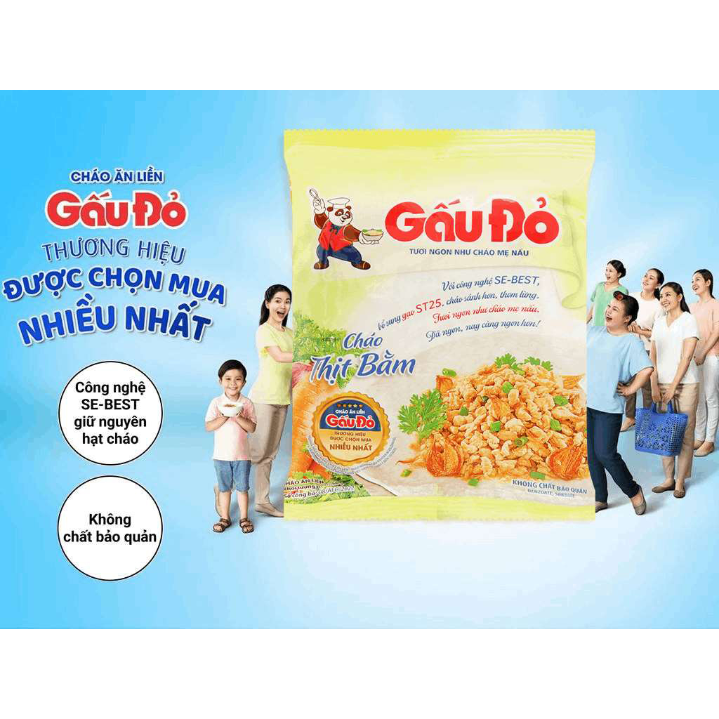Cháo có hương vị thơm ngon của hạt gạo nàng thơm, bổ sung thêm hương vị thịt bằm nguyên chất, tạo nên hương vị cháo ngon như cháo mẹ nấu. Công nghệ tạo hạt cháo Se - Best giúp bông cháo bung đều, giữ trọn vẹn dưỡng chất trong gạo và tạo sự ngon miệng khi ăn. Cháo Gấu Đỏ bổ sung Vitamin nhóm B, D, là thành phần dưỡng chất thường bị mất đi trong cháo tự nấu. Quy trình sản xuất khép kín đạt tiêu chuẩn an toàn vệ sinh thực phẩm, hoàn toàn không sử dụng chất bảo quản.