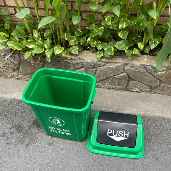 Kết cấu: 1 thân thùng, 1 nắp đậy bập bênh, thuận tiện cho việc xả rác.